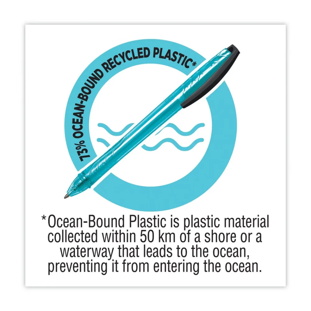 Retractable BIC ReVolution Ocean Bound ballpoint pen features a barrel made of ocean-bound recycled plastic. Packaging is also made entirely of recycled materials. This long-lasting, smooth writing pen is suited for many uses, from jotting down notes to drawing in the margins of your notebook. Once you run out of ink, no need to throw the pen away! Ink refills are available to extend this pen’s life. Join the BIC ReVolution and help write our future together.