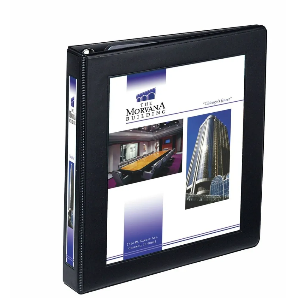 Now you don’t have to choose between clever design and good looks. This Framed View Binder has both. Clean, elegant border on front panel perfectly frames and centers your title page for a professional look. Clear cover and spine inserts allow you to easily customize your binder using free, easy-to-use designs and templates from Avery Design & Print (mounting sheets included). Two clear interior pockets and a business card pocket add to the professional image. Pages lie flat with back-mounted rings (exposed rivets on back). Wider front and back panels fully cover standard dividers and sheet protectors. In this binder, your presentation will get the attention it deserves.
