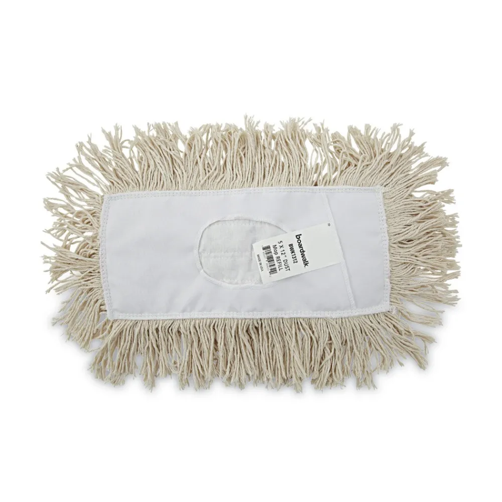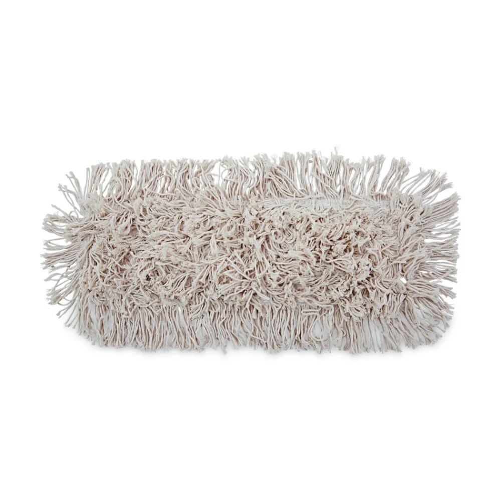 Ten-ply, Hygrade white cotton, cut-end design enhances durability while minimizing snags. Quick-drying, absorbent, slot pocket style with synthetic backing. Used for attaching a mop handle and dusting floors. Works with spray or liquid dust mop treatment and other solutions used to dust floors and add shine. Great for general purpose cleaning and wiping floor surfaces of various materials. Mop handle and dust mop frame are sold separately.