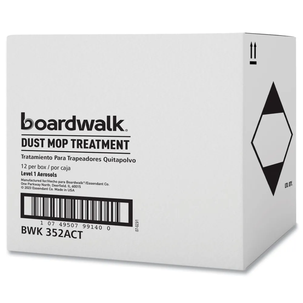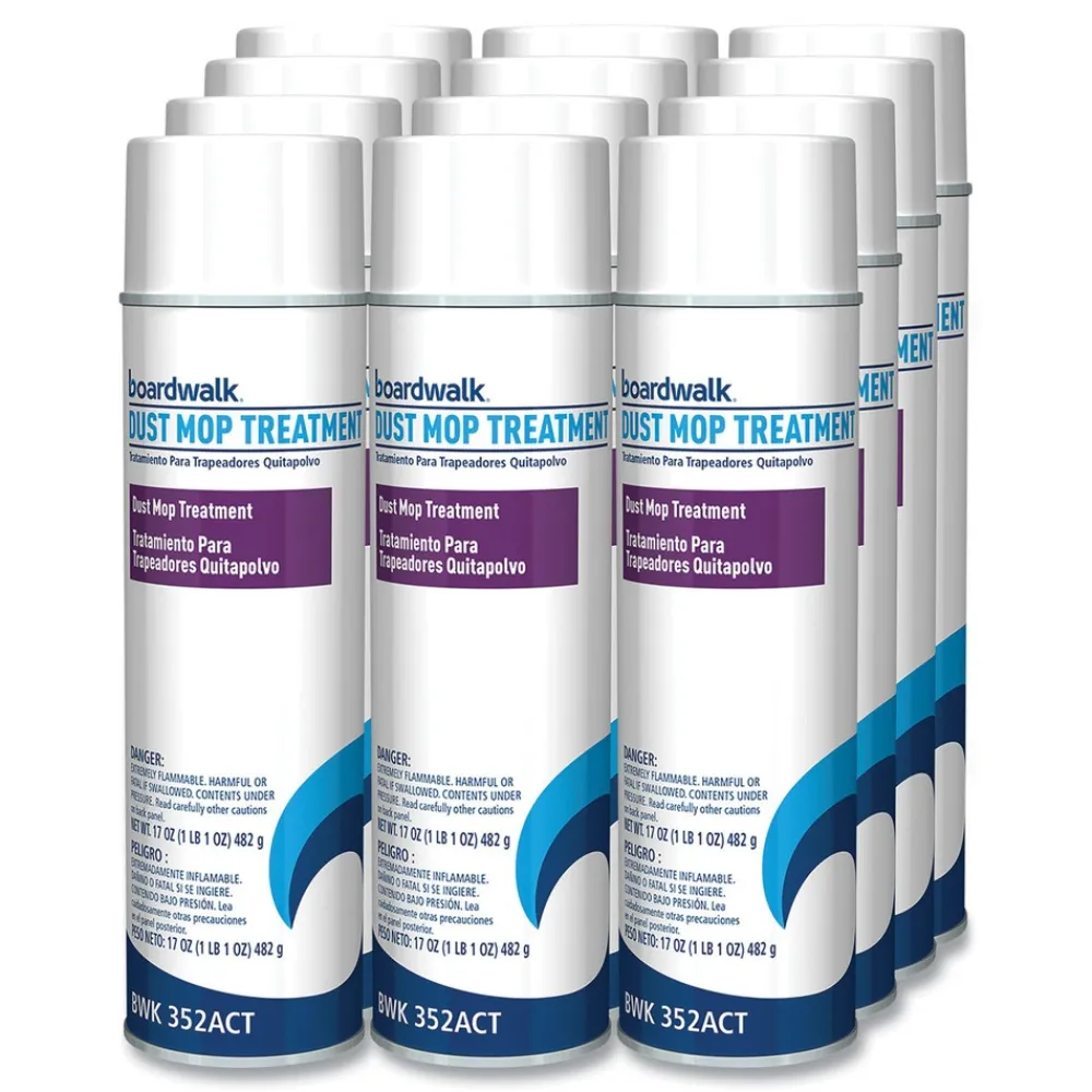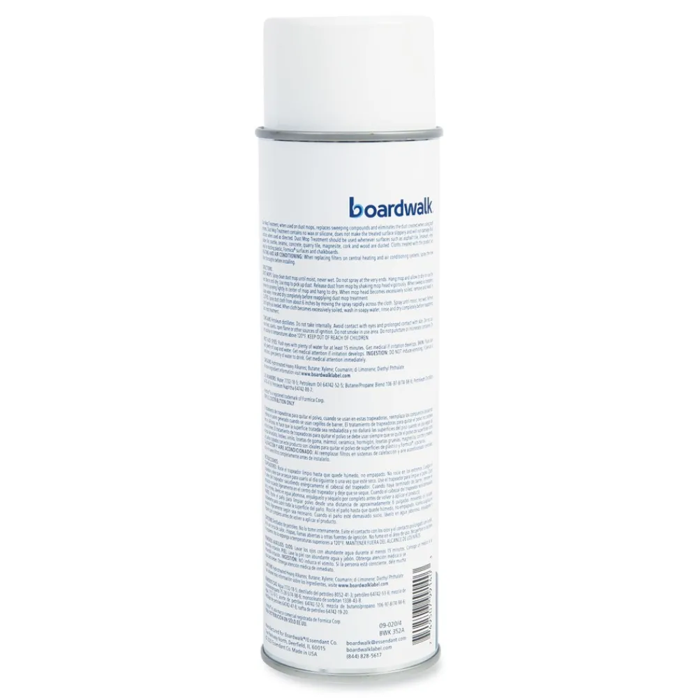 Boardwalk dust mop treatment captures dust when using push brooms. Aerosol can treatment goes directly onto a push broom with convenient spray nozzle. Will not damage surfaces and or make the floor slippery after use. Can be used in high-traffic areas to remove dust from linoleum, vinyl, rubber, marble, ceramic, concrete, quarry tile, laminate, and wood floors. Pine scent leaves room smelling fresh.