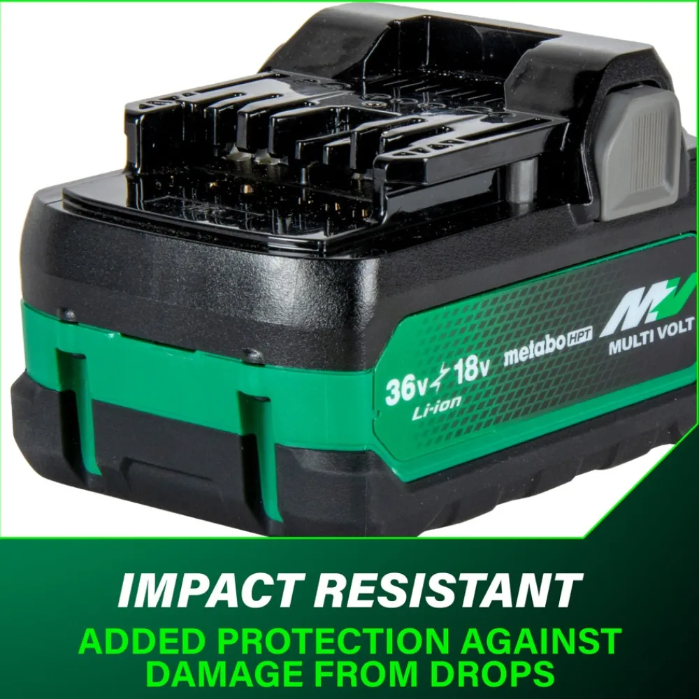 The MultiVolt Lithium Ion Water and Impact Resistant Battery (Model BSL36A18X/ part #380083M) is the next generation of high power Metabo HPT MultiVolt batteries to fuel our expanding line of 18V and 36V tools. For better defense against moisture related short circuiting, a waterproof barrier exists for the internal cell terminals and twin exit ports for water that gets inside the battery pack. To lessen damage from drops and rough use on the job site, an impact resistant protective layer provides 15% more shock absorption and a longer battery life than previous models. It has a 5 Ah capacity when used with 18V tools and 2.5 Ah capacity when used with 36V tools and features a battery fuel gauge for user convenience. The innovative design of this MultiVolt battery helps prevent overheating when pushed to the limit, and works at temperatures as low as 14 degrees F (-10 degrees C). The MultiVolt Lithium Ion Battery platform changes what’s possible on the jobsite by offering the power of a corded tool, the freedom of a cordless platform and the choice to operate all Metabo HPT cordless tools. The 18V/36VMultiVolt Water and Impact Resistant battery comes with a 2 year warranty. Every Metabo HPT battery is designed to the highest standards and is rigorously tested for both performance and durability.