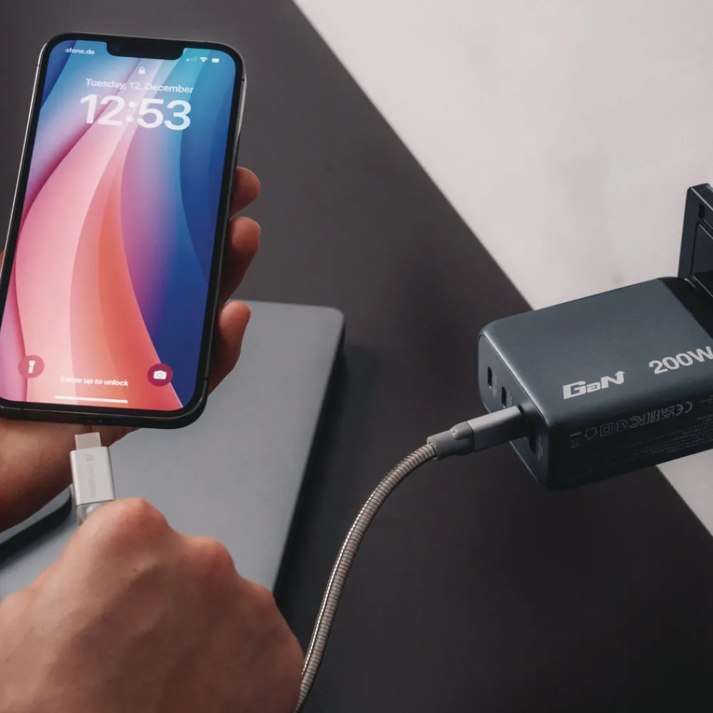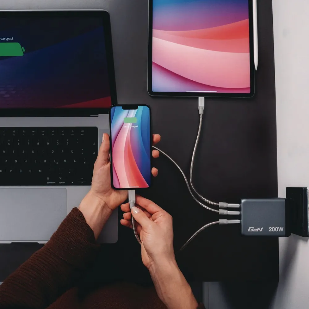 Supports charging of up to four devices simultaneously with a maximum total output of 200 W.