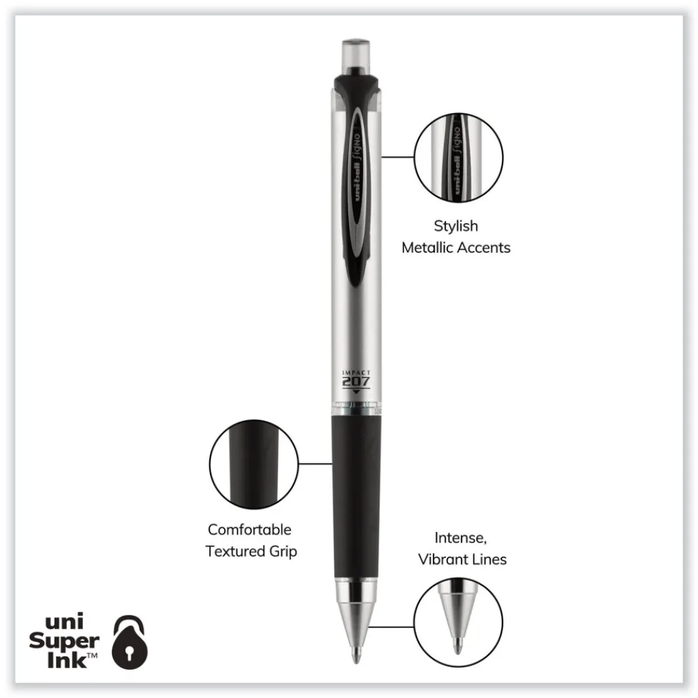 Make an impact with 207 IMPACT RT Gel Pens from uni-ball featuring a 1.0 mm bold point with a stainless steel tip that resists bending and breaking. Even-flowing, pigment-based gel ink renders an outstanding ink laydown for a smooth writing experience and strikingly bold lines. Use these retractable gel pens for everyday writing tasks, check signing and all of your important signatures, trusting its quick-drying uni Super Ink. Exclusive uni Super Ink technology entrenches the gel ink deep into the paper, preventing document alteration, water damage or fading. The 1.0 mm point delivers bold writing with a silky finish. A soft rubber grip helps you continue writing without fatigue while maintaining precision and detail throughout your tasks, and when your writing is complete, the innovative clip auto retracts the tip, protecting against unwanted gel ink marks and stains. Lend a vivid touch to your writing with these sophisticated retractable gel pens that glide smoothly for distinct and neat writing.