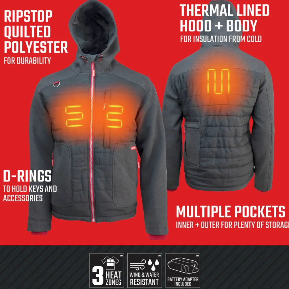 CRAFTSMAN Women’s Hybrid Heated Jacket Whether working outside in cold weather, attending winter sporting events, walking the dog in inclement weather, or just keeping warm on a cold and blustery day, the CRAFTSMAN Women’s Hybrid Heated Jacket provides hours of core body warmth and continuous heat. This jacket features 3 core heat zones and 3 temperature settings with pre-heat to control and change the level of heat as weather and activity conditions change. The outer ripstop quilted polyester shell and knit sleeves are wind and water resistant, the fleece lining is soft and cozy, and the poly taffeta sleeve lining allows for an easy on and off. Fully outfitted with a CRAFTSMAN V20 Lithium-Ion battery and an adapter for charging portable accessories, she’ll appreciate the durability and reliability of this fashionable and functional hybrid heated jacket at work and at play.