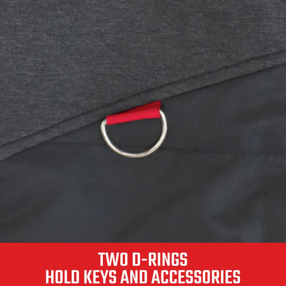 D rings in lower pocket and on shoulder to hold keys, head phones or other accessories