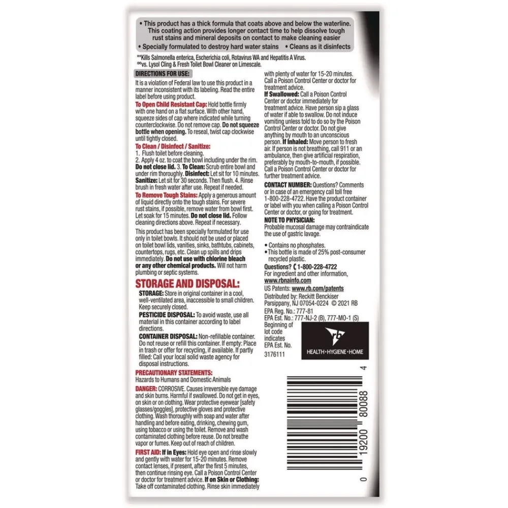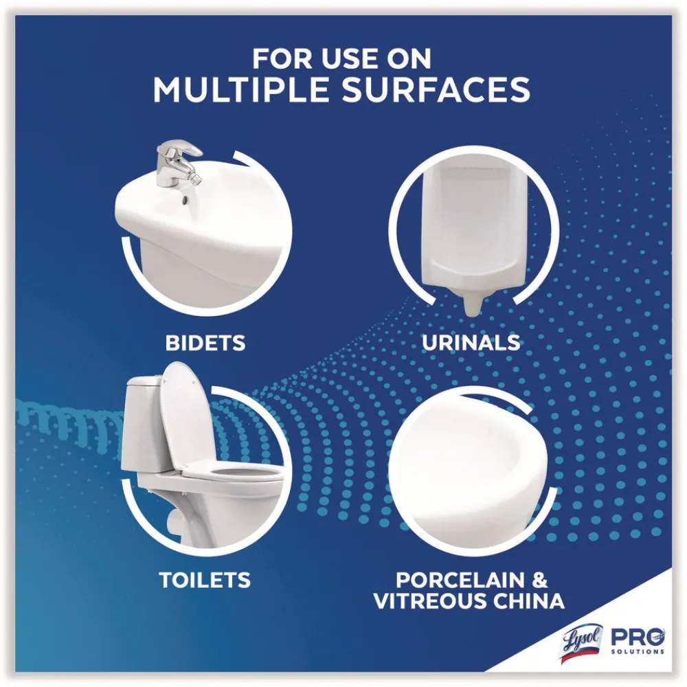 Clean, disinfect, and deodorize urinals and toilet bowls to give guests a clean bathroom experience. Meet staff and customer expectations around cleanliness with Lysol® Toilet Bowl Cleaner. Optimize restroom cleaning time with a powerful formula that works on the toughest toilet stains in seconds. Remove hard water deposits with the thick 9.5% hydrochloric acid formula that adheres to stains for better cleaning and coats the bowl above and below the waterline. Lysol kills 99.9% of viruses and bacteria when used as directed. Elevate restroom experiences throughout facilities for customers and staff with a powerful cleaning formula that helps leave surfaces shiny. Will not harm plumbing or septic systems.