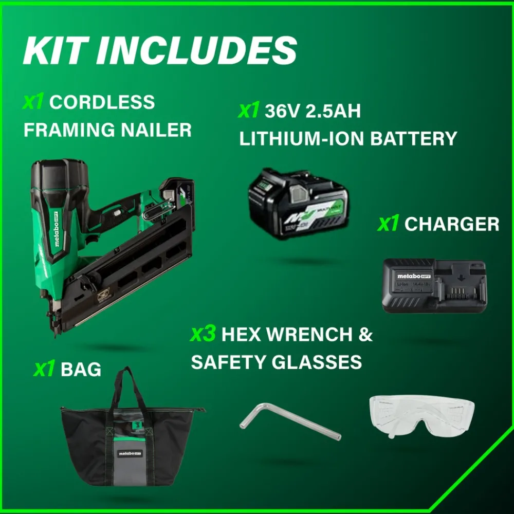 Metabo HPT NR3690DCM 36V MultiVolt 3-1/2 in. Cordless Paper Strip Framing Nailer Kit (2.5 Ah)