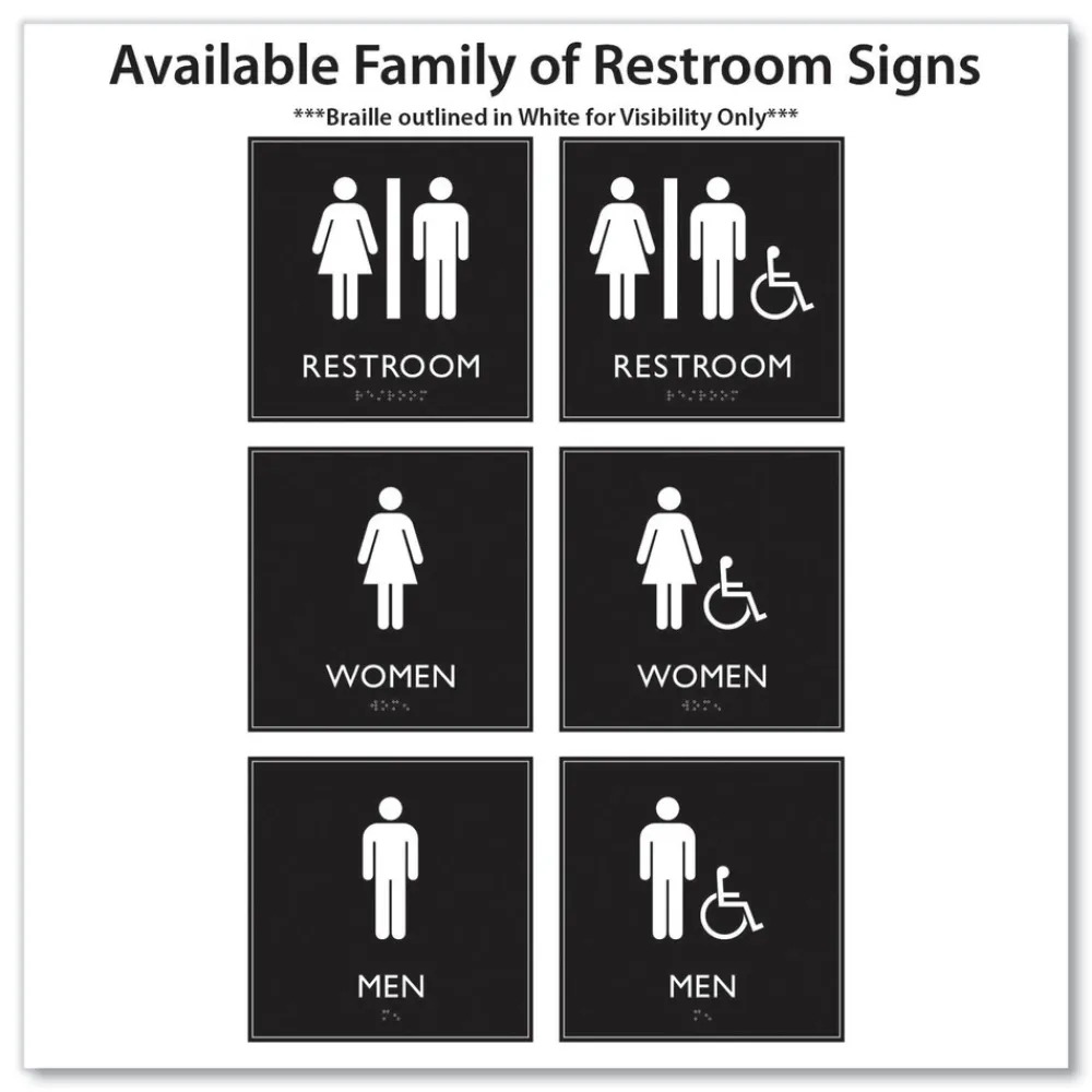 Universally and easily recognizable white graphics. Raised tactile graphics with Grade 2 Braille. Meets Americans with Disabilities Act (ADA) requirements. Includes double-side adhesive tape for mounting to door or wall.