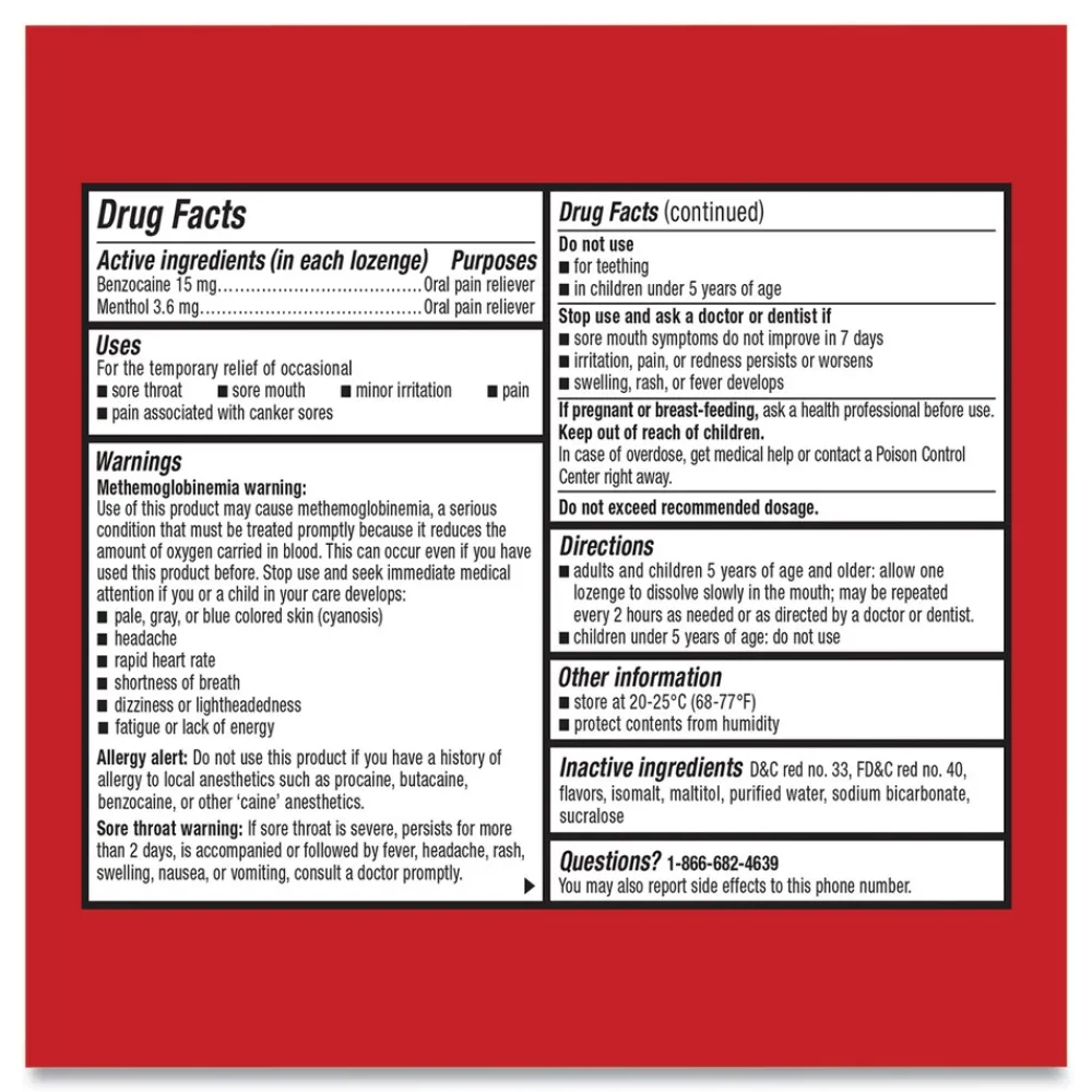 Instantly relieves sore throat pain with a numbing anesthetic. Provides relief of occasional sore throat, sore mouth, minor mouth irritation and pain associated with canker sores.