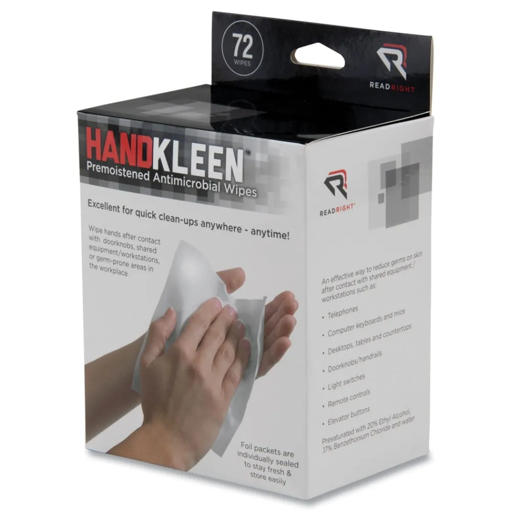 The ideal hand-cleaning wipe, the Read Right HandKleen Pre-moistened Cleaning Wipes are perfect for sanitizing hands in situations when soap and water are not available. Kills germs from hands and moisturizes skin with an infusion of aloe vera. Perfect for cleaning hands when at work, at home, in the classroom, when traveling on car trips or airplanes, or just about anywhere.
