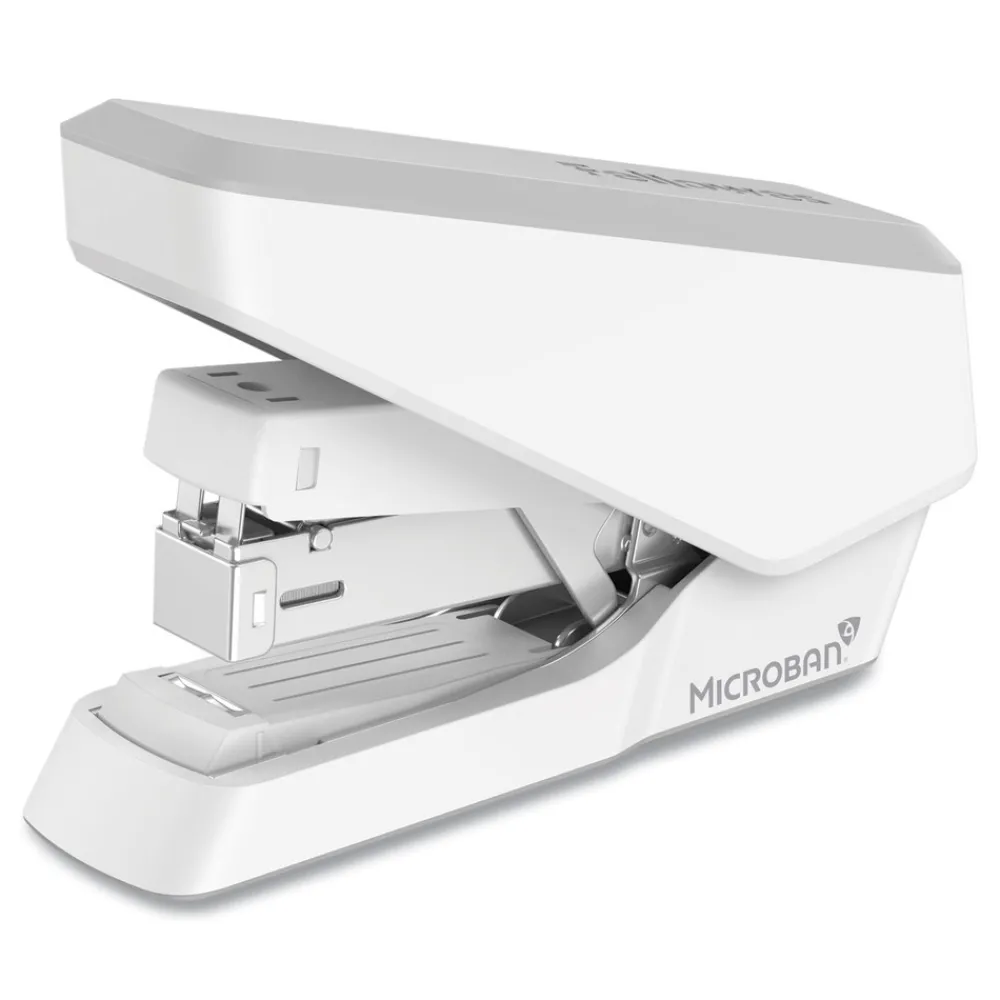 This stapler is treated with Microban antimicrobial technology to help prevent bacteria and works 24/7 for an added level of product protection. Smooth, jam-free performance ensures successful stapling every time. EasyPress technology offers easy stapling up to 40 pages. Each staple clinches flat for a neat, professional finish and easy stacking of multiple stapled copies. Low staples indicator allows you to quickly see when staples are running low. High-quality desk stapler designed for home or office and holds a half strip of staples.