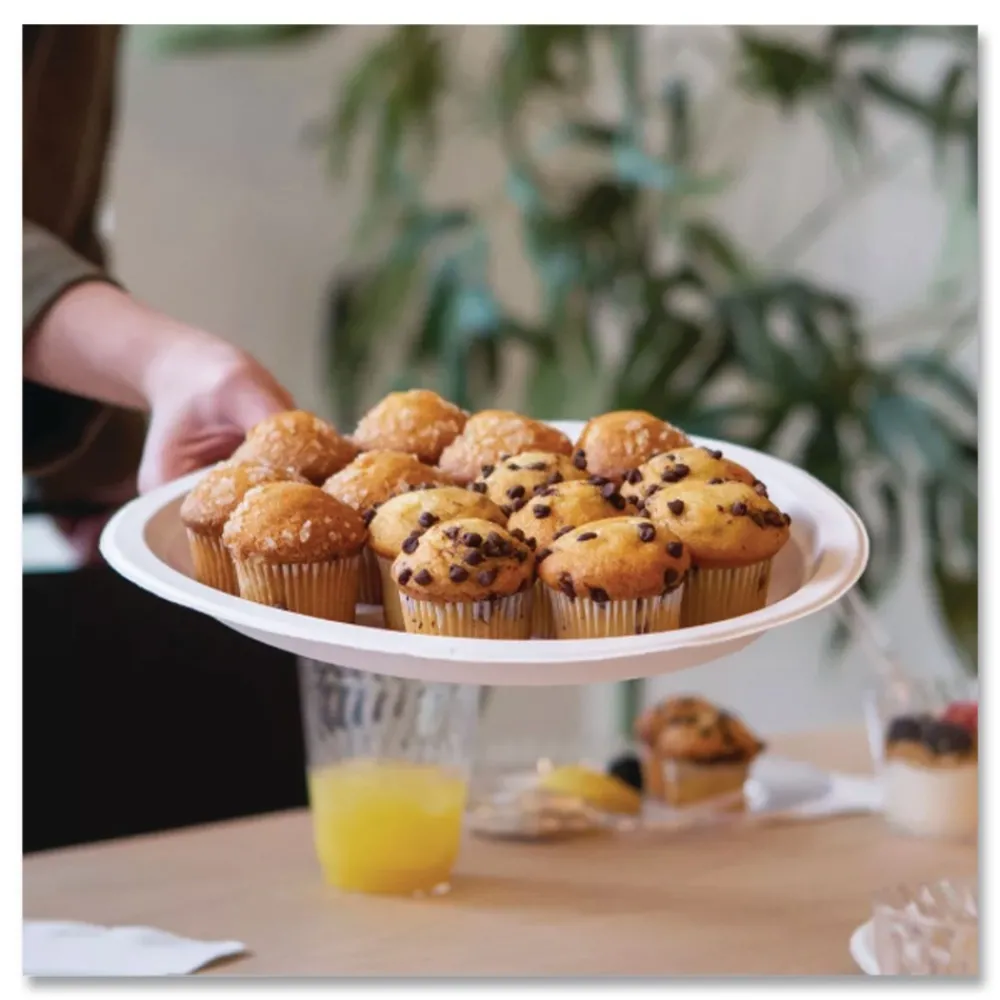 Get the impressive strength of molded fiber at an economical price. Extra-rigid dinnerware supports whatever you dish out, without requiring wasteful doubling. Decorative, highly practical rim edge helps prevent spillage.