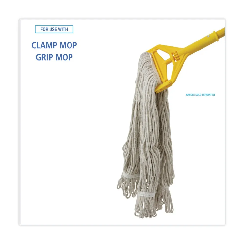 This sturdy mop head is made with premium four-ply yarn and a heavy-duty, polyester tape headband. Constructed with a looped-end design that minimizes less lint, fraying, and unraveling. Built to be durable, the double-sewn tailband prevents tangles and provides more floor coverage. Made from high-quality fiber. Great for general cleaning or floor finishing. For use with clamp style mop handles, which are sold separately.