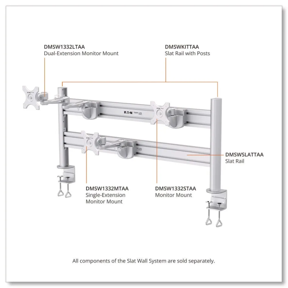 This 40″ slat rail allows mounting of multiple displays simultaneously. It adds another slat rail and easily installs to your existing Slat Rail with Posts (DMSWKITTAA), sold separately, so you can install more monitors in your workspace. Monitors are elevated above the desktop, which frees up precious workspace. You can also slide the monitors along grooves and then adjust the viewing angle for optimal ergonomics. Grooves on both sides of the slat rail accommodate independently adjustable monitor setups when desks are pushed together back-to-back. In addition, this slat wall system also has options for three VESA-compliant monitor mounts (DMSW1332STAA, DMSW1332MTAA and DMSW1332LTAA), all sold separately. Compliant with the Federal Trade Agreements Act (TAA), which makes it eligible for GSA (General Services Administration) Schedule and other federal procurement contracts.