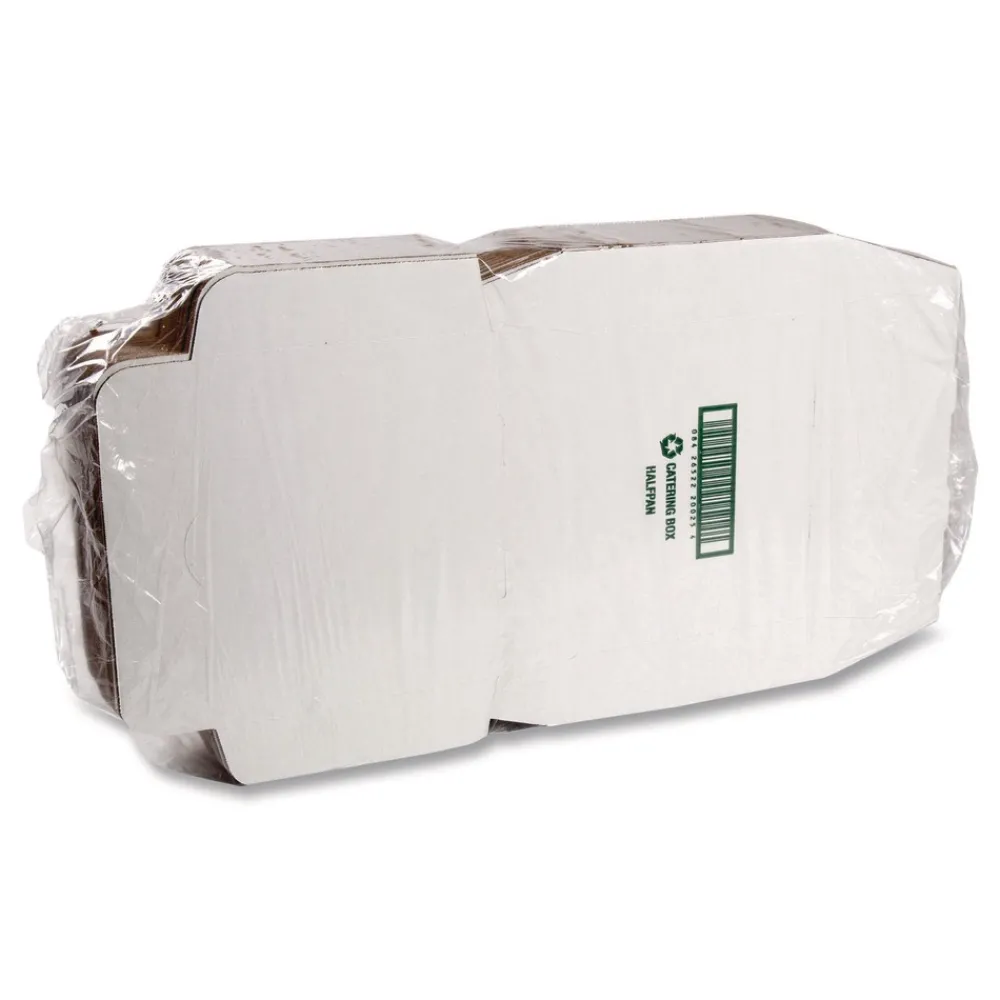 Corrugated Catering Box has sturdy angled designs allowing for secure transport and help maintaining food integrity during delivery and beyond. Easily transport prepared food in foil pans (sold separately). Angled design helps with stacking.