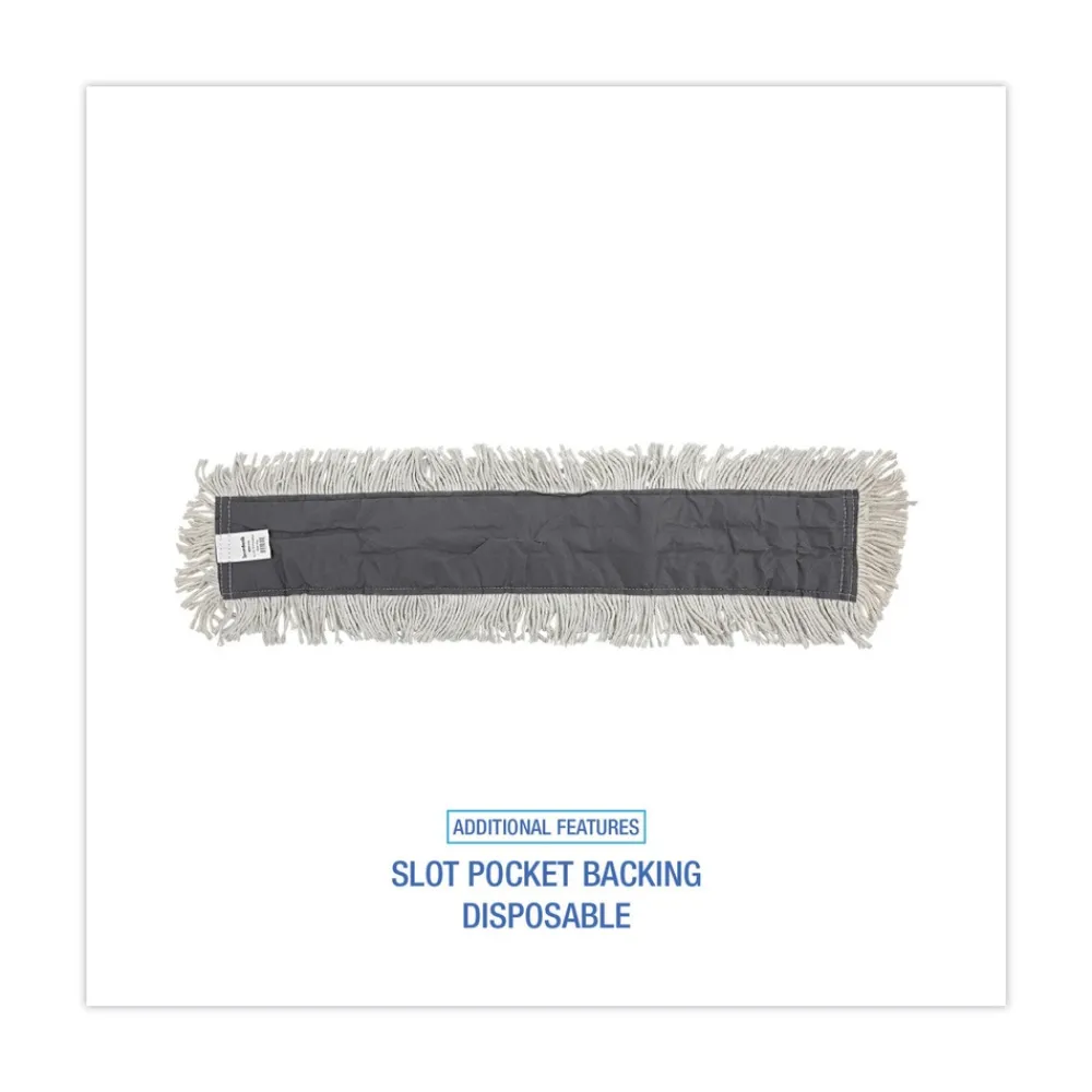 4-ply, pretreated yarn, dust mop head. Equipped with a slot pocket backing which allows a metal dust mop frame to slide into its place quickly and easily. Sewn center fringe for added coverage and durability. The disposable head can be discarded when dirty. Ideal for use on floors that require dusting, with or without cleaning spray. Handle and frame are sold separately.
