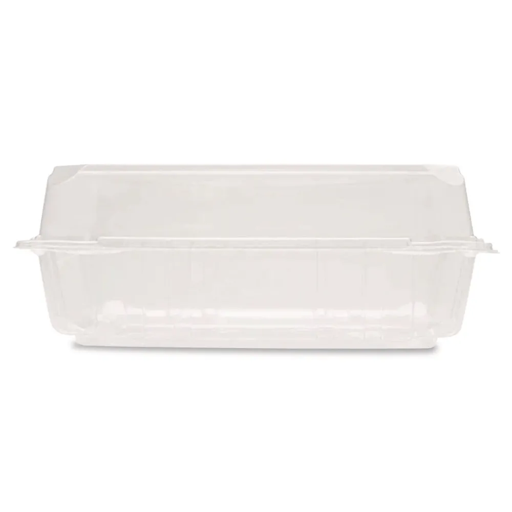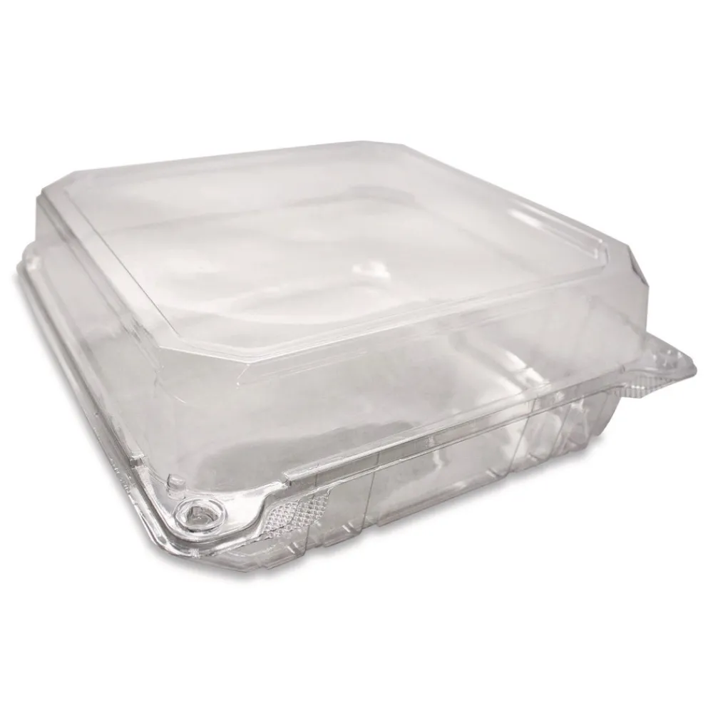 Karat PET hinged container line is made up of crystal-clear plastic that allows for easy visibility. The clear PET containers are heat-resistant, ranging from -10F to 120F, and are less prone to cracking. These containers are very sturdy and versatile, making them suitable for all types of food packaging.