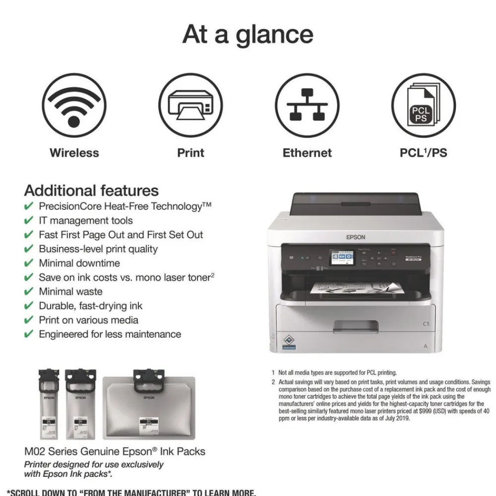 Powered by PrecisionCore® printing technology, the WorkForce® WF-M5299 delivers Performance Beyond Laser™ all in a compact printer. Save up to 30 percent on low-cost replacement ink packs vs. mono laser toner. Featuring an ink pack yield up to 40,000 ISO pages, the WF-M5299 includes an innovative Replaceable Ink Pack System to minimize interventions. Designed for your busy workgroup, it prints pro-quality documents at 24 ISO ppm (black). Network setup and security features provide seamless integration and administration in select managed IT environments. The WF-M5299 supports wired and wireless networking, plus PCL and PostScript®.