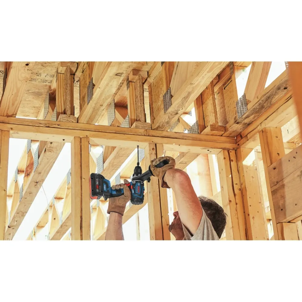 This Bosch PROFACTOR 18V Drill Driver is built for tough drilling and driving jobs, especially drilling large holes straight. The 1/2 in. GSR18V-1330C Drill Driver is part of the PROFACTOR System, which pairs BITURBO Brushless Technology with a CORE18V High Power Battery. BITURBO Brushless Technology is a high-performance motor and drive-train system designed to deliver power comparable to high-demand corded tools. This GSR18V-1330C 18V Connected-Ready 1/2 in. Drill Driver features connectivity (module sold separately), linking to a connected device via Bosch Toolbox App to customize settings, receive feedback, and set specific angles for the Electronic Angle Detection feature. It has a powerful brushless motor that provides efficient power for up to 1,330 in-lbs. of max torque. It has variable speed settings: high speed (0-2,200 RPM) and high power (0-550 RPM). The drill driver has KickBack Control, which helps reduce the risk of injury from sudden rotational torque reaction in a bind-up scenario, and Electronic Angle Detection to ensure accurate drilling at an angle. The 25 clutch settings help reduce fastener damage. It has an all-metal chuck that provides durability. The kit includes a CORE18V 8 Ah High Power Battery, which delivers 50 percent more runtime and over 75 percent more power than the CORE18V 4 Ah battery, powering high-demand applications.