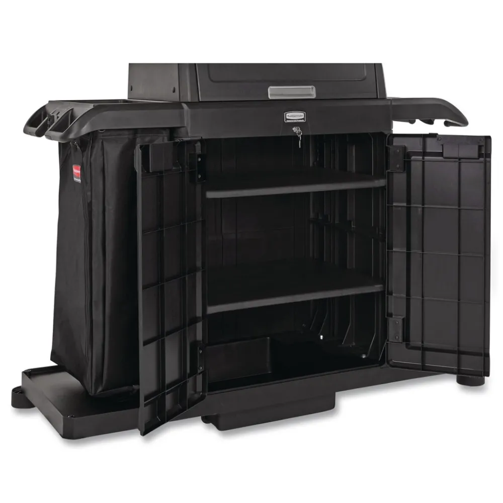 Rubbermaid Commercial 2202587 24.4 in. x 62.4 in. x 56.9 in. 4-Shelf Housekeeping Cart with Hood and Doors – Black