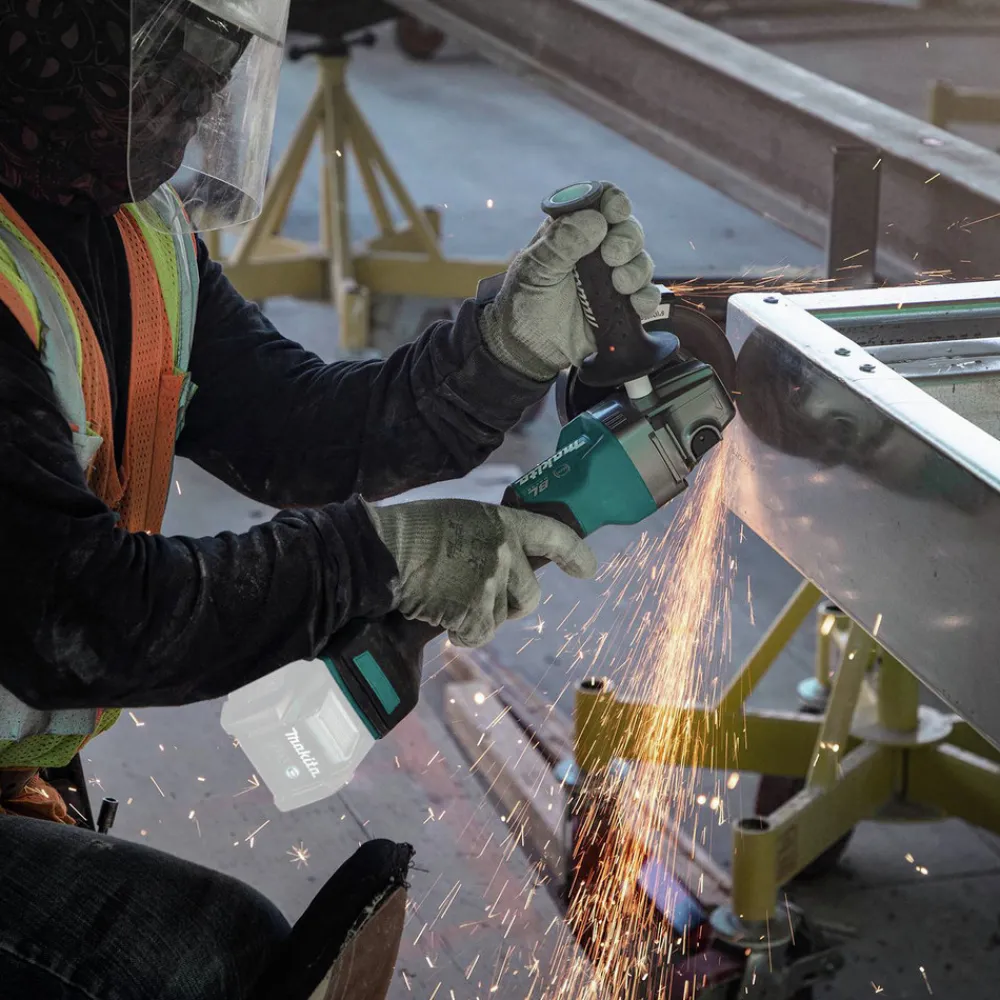An electric current limiter helps protect the motor from overload in high-torque applications. Makita’s exclusive Automatic Speed Change technology automatically adjusts speed and torque during operation for optimal performance. Additional features include an electric brake that stops the grinding or cut-off wheel in 2 seconds or less and Active Feedback-sensing Technology (AFT) that turns the motor off if rotation of the wheel is forced to a stop.