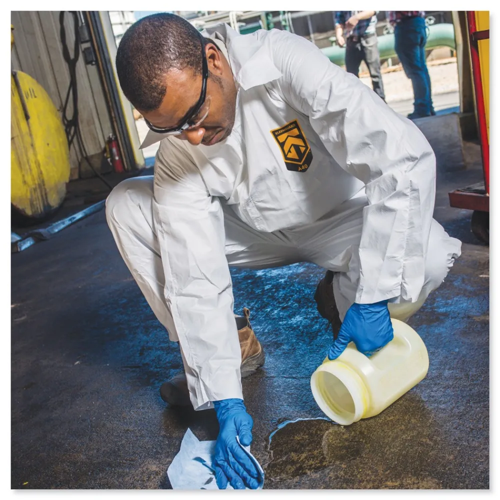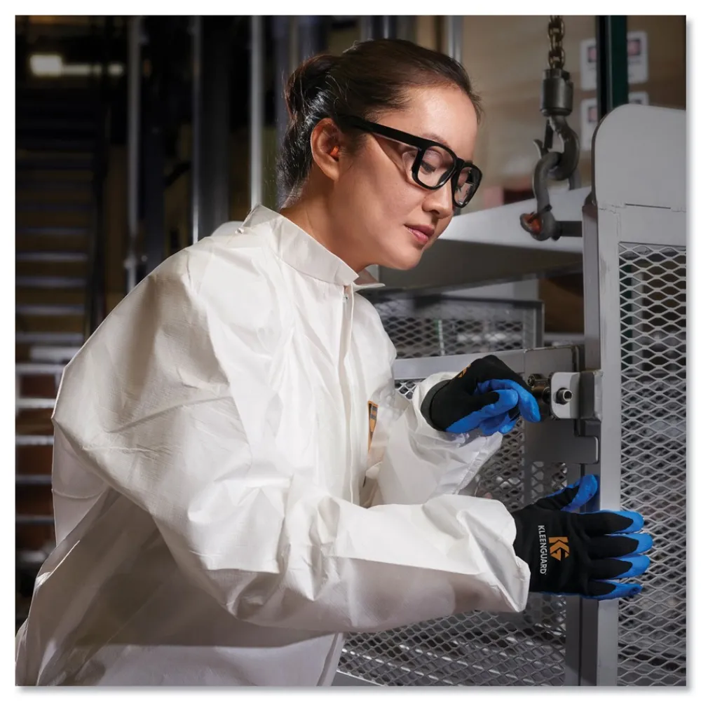KleenGuard Personal Protective Equipment (PPE) enables rather than inhibits allowing for maximum productivity and safety for you and your employees. When your workers are in nonstop contact with liquid splashes and particles, KleenGuard A40 Liquid and Particle Protection Coveralls are a great addition to offer your team comfortable protective clothing. Features to provide more protection include the seamless front (for primary exposure area) and 1 in. zipper flap. They feature REFLEX design, which offers excellent fit and comfort (with elastic in the back) and freedom of movement. Made of breathable, microporous film to keep out debris, non-hazardous liquid chemicals and dry particulates, the KleenGuard A40 material gives your employees a better liquid barrier and a better particulate barrier than the leading competitor. These coveralls with hood pass NFPA 99 for antistatic materials, and pass ASTM F1670 testing for penetration of blood and bodily fluids. Popular industries using this product include liquid handling, aviation, pharmaceutical manufacturing, general manufacturing and so much more. Making the right Personal Protection choice is difficult. Perform with distinction with KleenGuardâ„¢ Personal Protective Equipment (PPE).