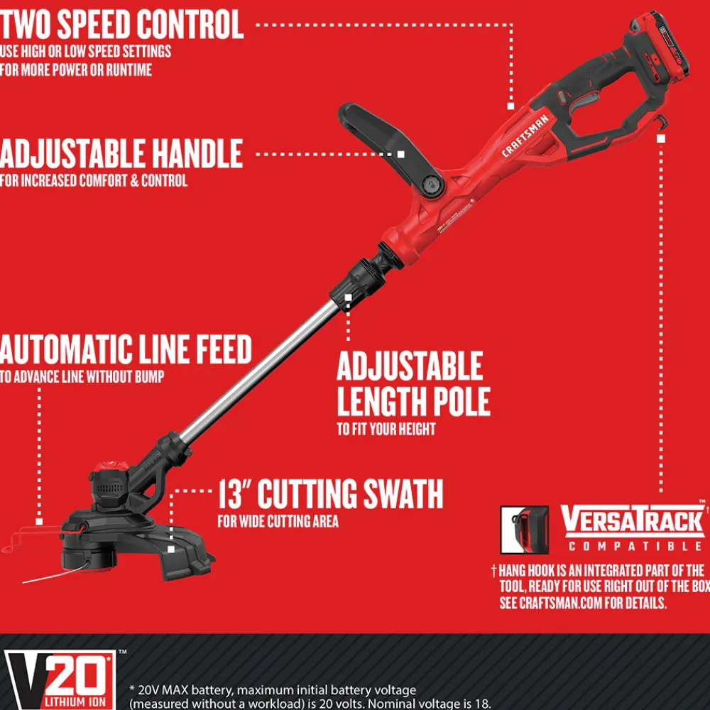 20V Cordless 13 in. WEEDWACKER String Trimmer/Edger features a high efficiency motor and is equipped with a 2 Ah battery allowing you to take on the tasks at hand. Once the task is complete, conveniently store using the integrated VERSATRACK hook with the VERSATRACK system (sold separately). The 20V battery platform is compatible with CRAFTSMAN 20V Outdoor Equipment and Power Tools. You’ll find the complete line of outdoor tools and equipment essentials for a job to make you proud.