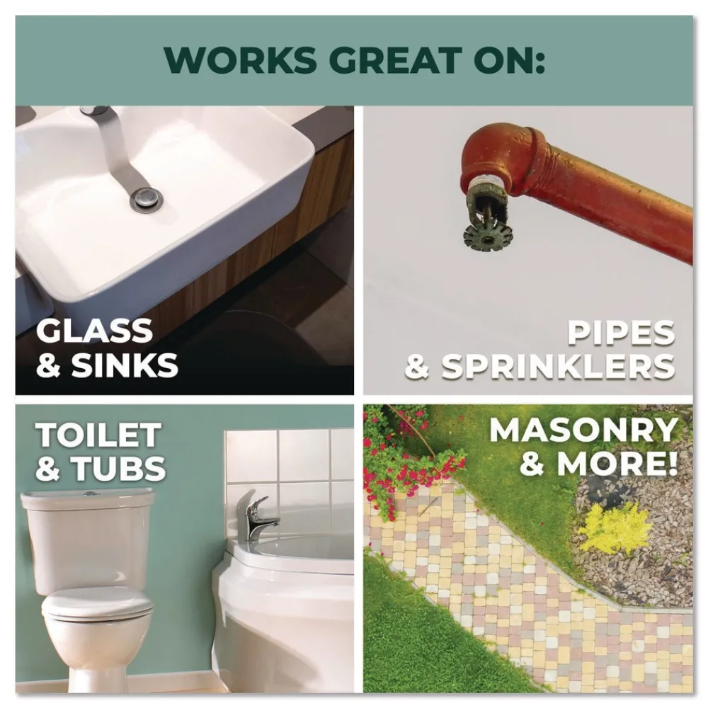 Powerful descaler removes even tough, built-up lime scale, mineral deposits, hard water stains, soap scum and oxidation with ease.
