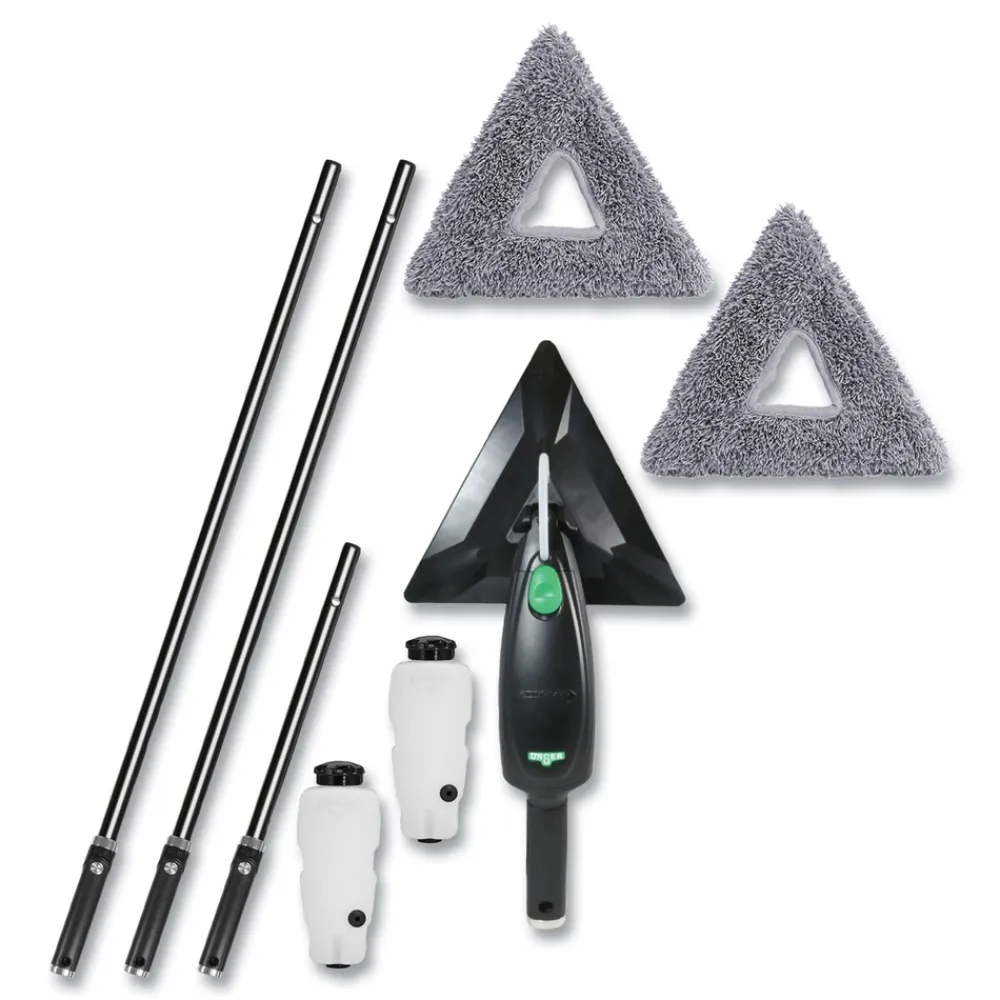 Stingray indoor surface cleaning equipment quickly cleans your indoor glass drip-free, along with your wall, desk, tabletop and plexiglass surfaces. Easily reach high access or hard-to-reach areas without the need for ladders or the time-delaying task of moving furniture. Whichever Stingray surface cleaning equipment you choose, the unique design will help clean windows and surfaces up to 25 percent faster with 39 percent fewer chemicals. This kit includes a 2-ft extension pole, two 4-ft extension poles, two glass washing pads and two refillable bottles.