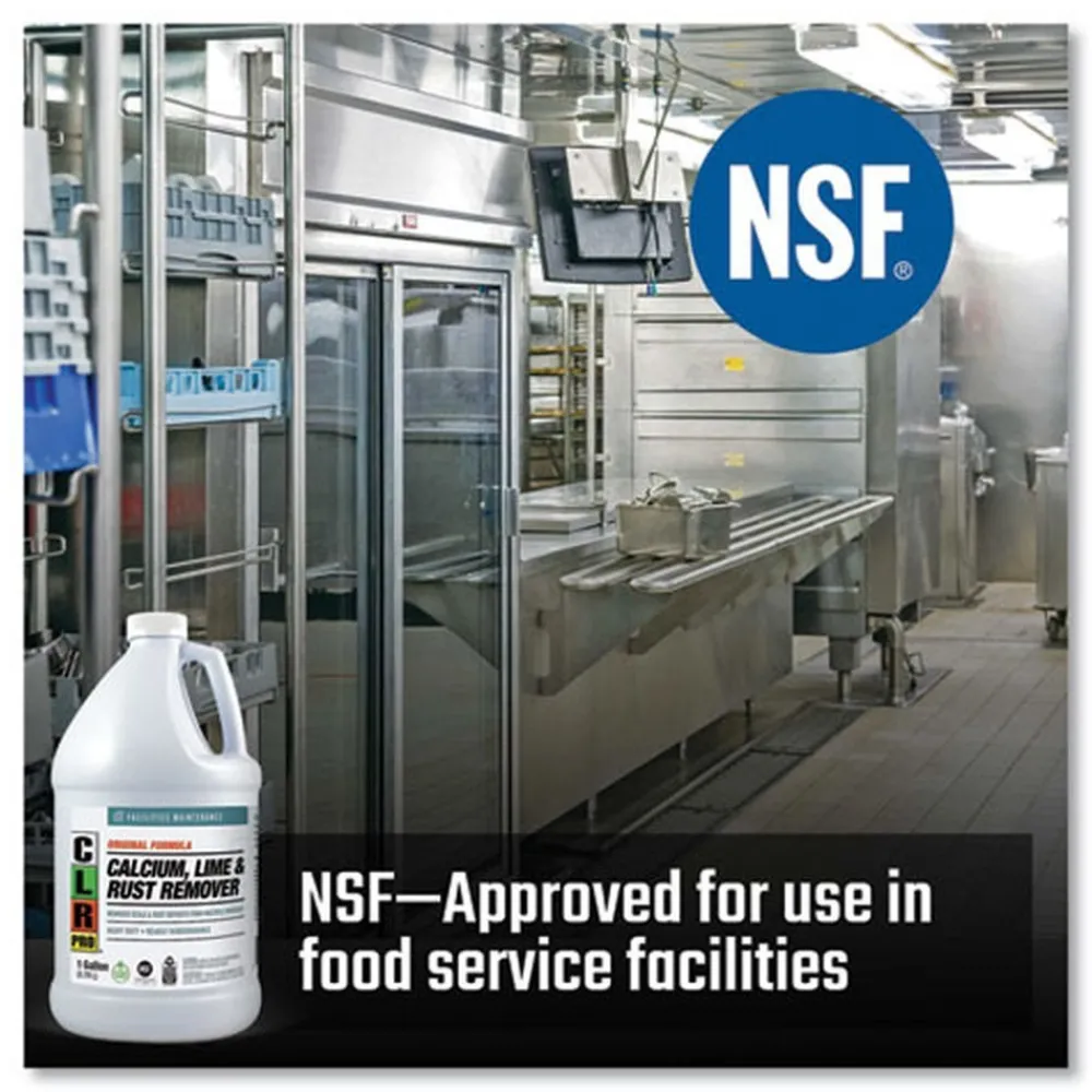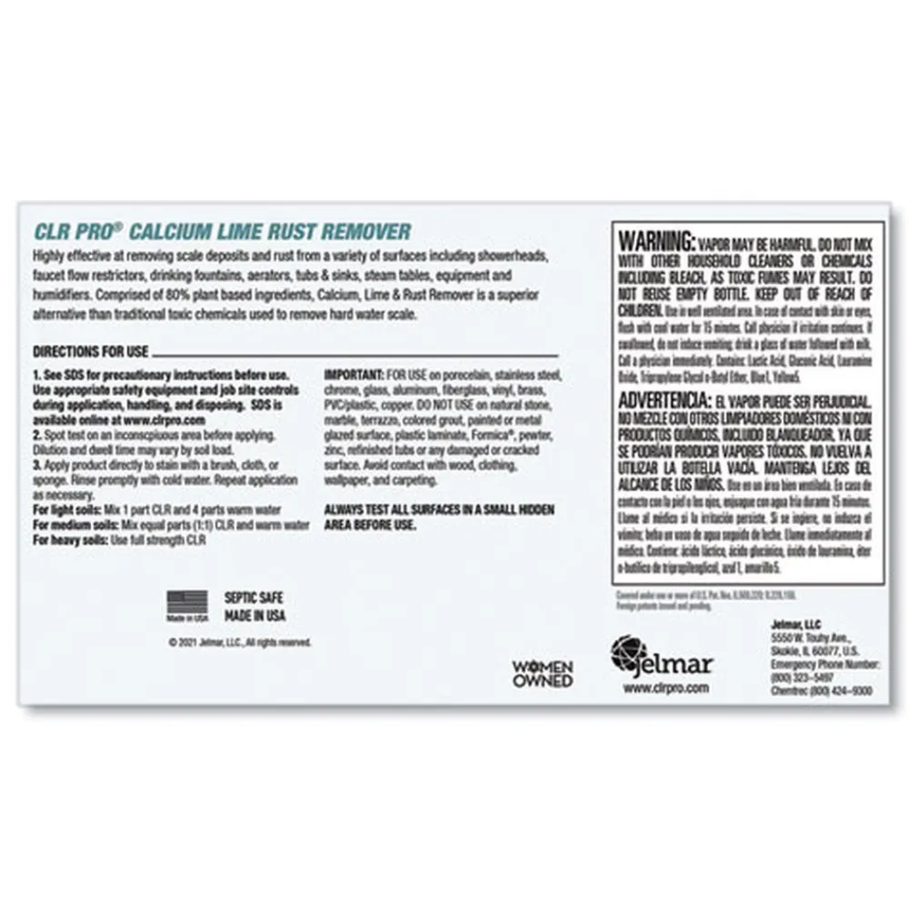 Powerful, trusted multi-use cleaner dissolves even the hardest calcium and lime buildup, rust, mineral deposits, hard water stains, soap scum, and oxidation. Certified EPA’s Safer Choice for safer chemistry means that this formula is safe for use in a wide variety of applications including dishwashers, coffeepots, sinks, toilets, glass, siding, stucco, sprinkler systems and more! CLR PRO Calcium, Lime and Rust Remover is NSF Registered and is approved for use in food processing, food storage, and food service facilities. Plumbing and septic safe. Phosphate-, bleach-, ammonia- and alcohol-free.