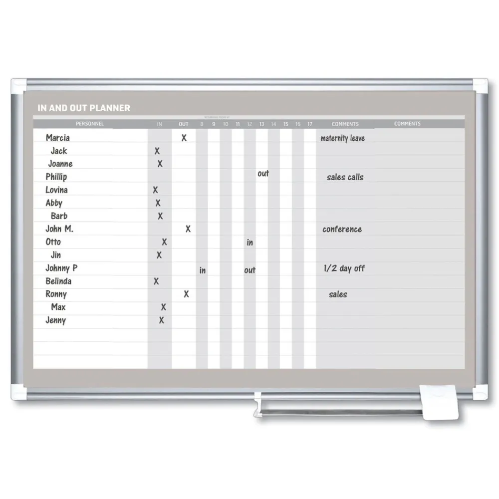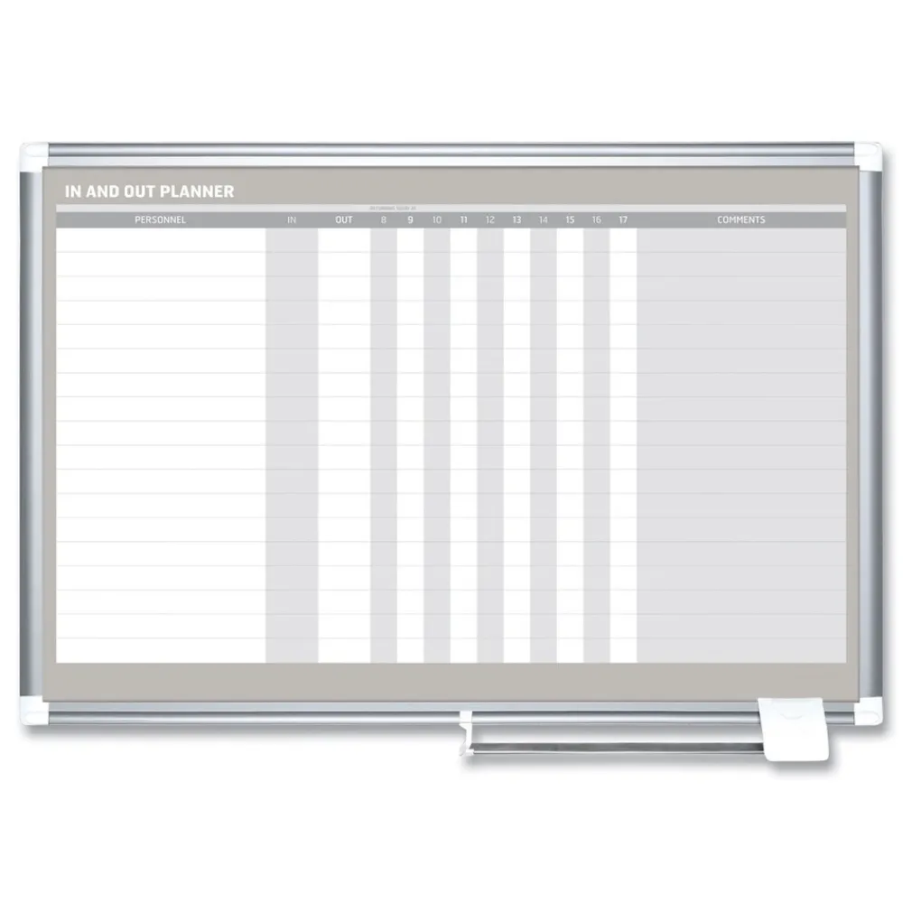 In and Out board features rows for employees or visitors and is perfect for displaying staff schedules. The Magnetic Gold Ultra dry erase lacquered steel surface is recommended for frequent use. The Sliding aluminum pen tray keeps pens and magnetic accessories where you want them. Aluminum frame features the four-corner system for easy mounting.
