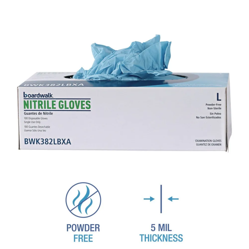 Boardwalk 382LBXA 5 mil 9.5 in. Long Powder-Free Disposable Examination Nitrile Gloves – Large, Blue (100/Box)