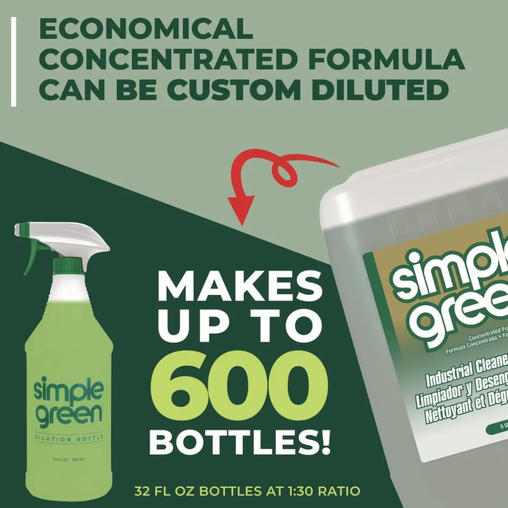 Simple Green Industrial Cleaner and Degreaser provides a safer alternative to caustic or acidic cleaners, bleaches and solvents. The trusted formula is non-abrasive and recognized by the U.S. EPA’s Safer Choice Program. Designed to be used on all washable surfaces, Simple Green powers away heavy dirt, grease, food residue and stains from countertops, sinks, tile, carpet, flooring, upholstery and more. The cost-effective concentrate can be used manually or in cleaning equipment such as such as floor scrubbers, dip tanks, carpet extractors, pressure washers, steam extractors and foamers. Easily cuts through tough grease, oils, cutting fluids, and built-up grime on equipment, engines, machinery, vehicles and manufactured parts making it ideal for a wide range of industries including janitorial, manufacturing, MRO, food processing, mining, automotive, transportation and engineering.