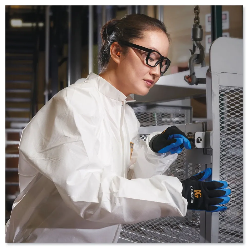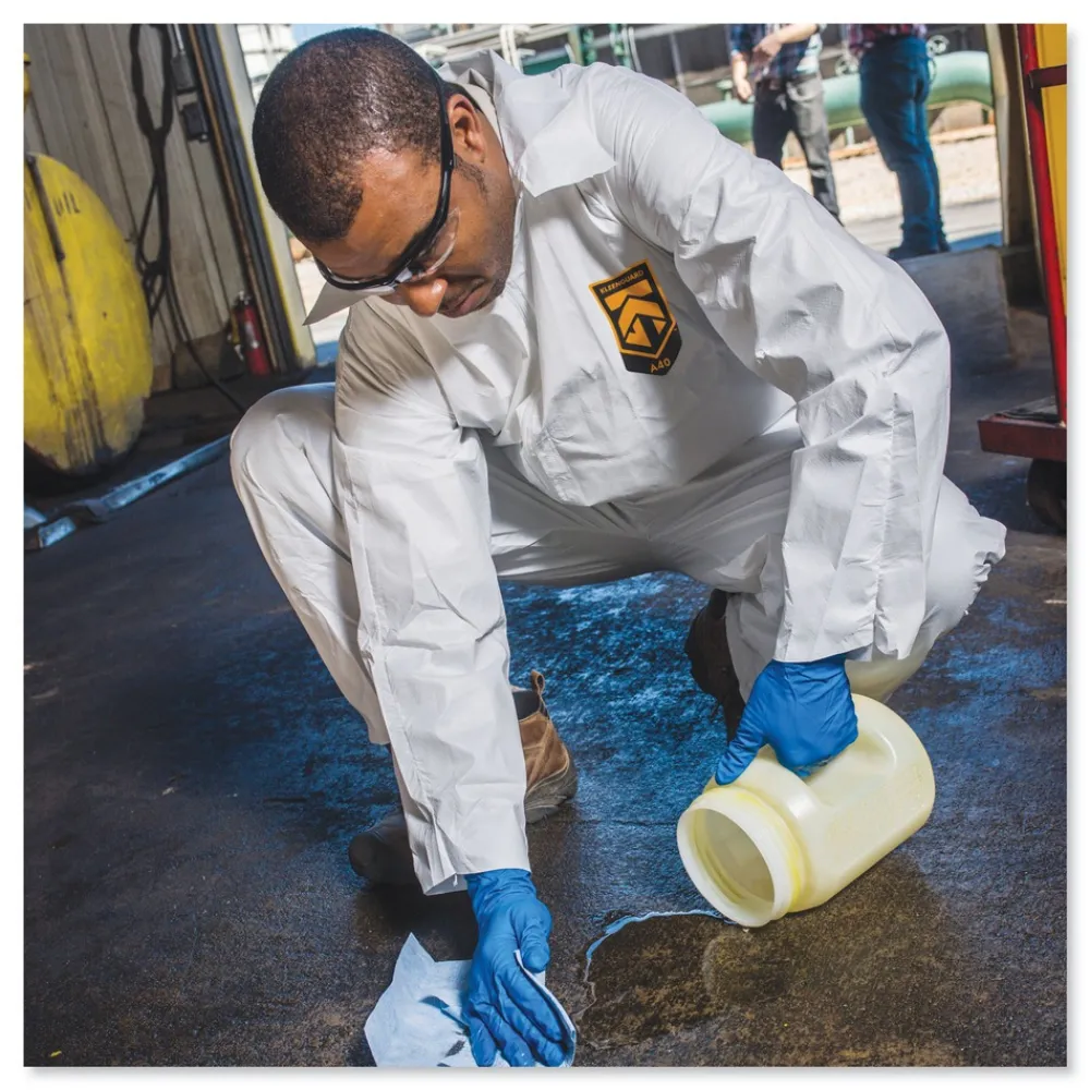 KleenGuard Personal Protective Equipment (PPE) enables rather than inhibits allowing for maximum productivity and safety for you and your employees. When your workers are in nonstop contact with liquid splashes and particles, KleenGuard A40 Liquid and Particle Protection Coveralls are a great addition to offer your team comfortable protective clothing. Features to provide more protection include the seamless front (for primary exposure area) and 1 in. zipper flap. They feature REFLEX design, which offers excellent fit and comfort (with elastic in the back) and freedom of movement. Made of breathable, microporous film to keep out debris, non-hazardous liquid chemicals and dry particulates, the KleenGuard A40 material gives your employees a better liquid barrier and a better particulate barrier than the leading competitor. These coveralls with hood pass NFPA 99 for antistatic materials, and pass ASTM F1670 testing for penetration of blood and bodily fluids. Popular industries using this product include liquid handling, aviation, pharmaceutical manufacturing, general manufacturing and so much more. Making the right Personal Protection choice is difficult. Perform with distinction with KleenGuard Personal Protective Equipment (PPE).