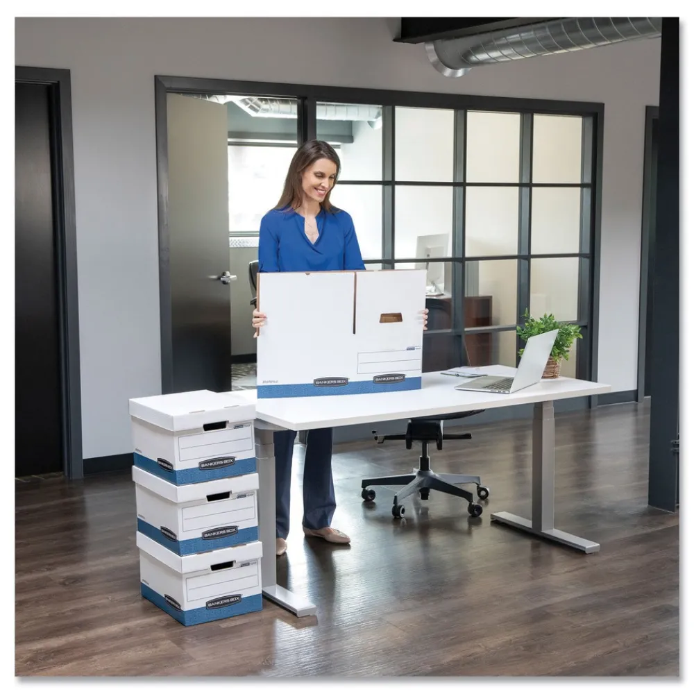 Heavy-duty, triple-end, double-side, double-bottom construction stacks up stronger and withstands frequent handling. FastFold quick and easy assembly. Reinforced tear-resistant handles make box comfortable to carry. Deep, locking, lift-off lid stays in place for secure file storage. Smooth rolled edges add strength and prevent paper cuts. Great for storing home or office papers, and other documents, along with a variety of materials and items that you need to store for safe keeping.