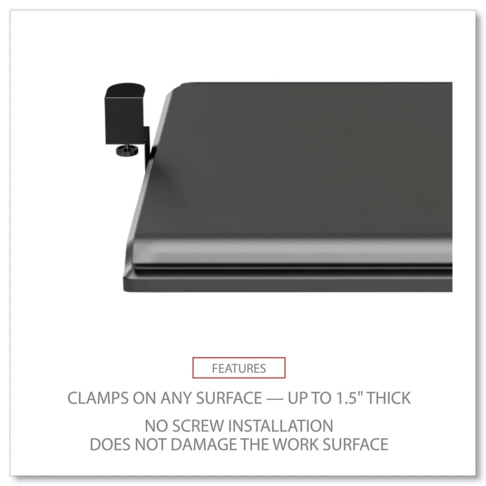 Smooth movement slide-out tray puts your keyboard right where you need it, under your desk for improved ergonomics. Easy to install with sturdy metal clamps on any surface up to 1.5 in. thick. No screw installation does not damage the work surface. Impact resistant, plastic tray fits most standard and ergonomic keyboards. A great choice when under-desk crossbars, hardware, or other obstructions make permanent mount keyboard trays impossible to install.