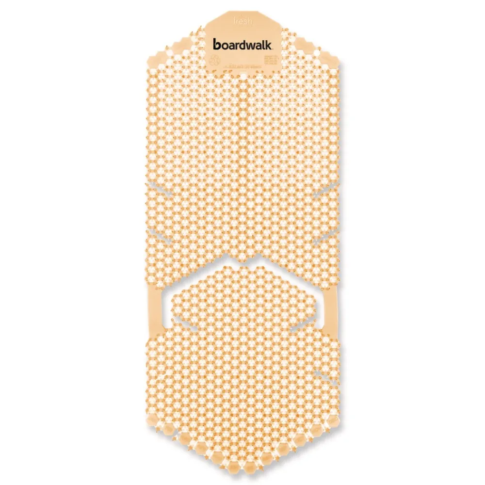 The vertical 60-day urinal screen contains three times more fragrance than competitors. The patented two-sided design eliminates 99% of urine splash on both sides for error-free installation. The Vertical screen doesn’t require mounting, simply place the base over the drain and lean the body up the back of the urinal and you’re done. No suction cups to engage so it’s faster and there’s less waste. Each screen has date tabs for replacement reminders and contains beneficial bacteria that consume odors and keep drains clean, clear and smelling fresh.