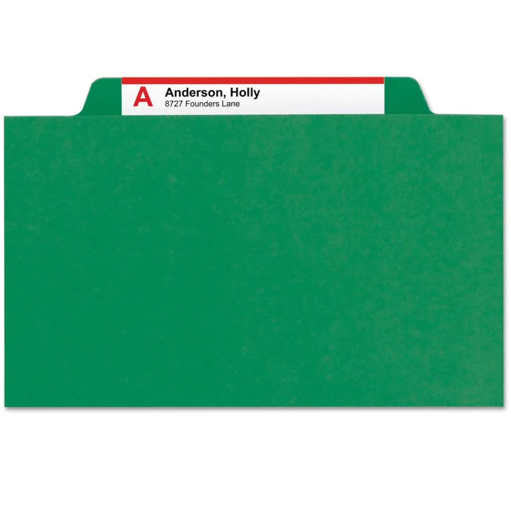 Minimize the time you spend searching for documents and increase the efficiency of your filing system. Smead’s Pressboard Classification File Folders with Pocket-Style Dividers and SafeSHIELD Fasteners make it easy to organize your critical information by providing multiple filing surfaces that can be used to separate your documents in subcategories and keep them in proper sequence. Purposefully designed to provide a solution for the most common fastener issues, our Pressboard Classification File Folders feature SafeSHIELD Coated Fasteners that help you avoid hand injuries, ripped papers and excessive fastener crinkling. The 2/5-cut tab in right of center position is compatible with our Viewables Multipurpose Labels (sold separately) and the 2 in. expanding spine made of tear-resistant material offers greater storage capacity for bulky projects.