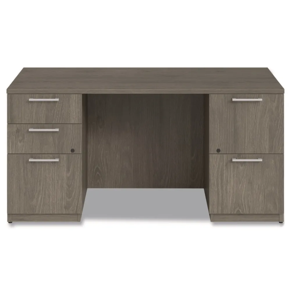 A thoughtfully designed piece that offers both functionality and style for any office environment. Equipped with two pedestals, this desk maximizes storage space to keep your workspace organized and clutter-free. These drawers offer versatile storage solutions for your office supplies, files, and personal items, allowing you to access what you need with ease. The double-pedestal design offers sturdy support, while the laser edge band construction enhances durability for long-lasting use. Crafted from particleboard, the desk is finished with a rich laminate and thermofused melamine (TFM), combining both strength and aesthetics. The premium laminate is resistant to burns and impacts, making this desk ideal for a high-traffic office setting. Its surface is designed to withstand the daily wear and tear of a busy work environment, ensuring that it maintains its sleek appearance over time. To enhance functionality, the desk includes two grommets for convenient cable management, allowing you to keep wires and cords organized and out of the way. Additionally, adjustable glides provide stability on uneven flooring, ensuring a level surface no matter where the desk is placed.
