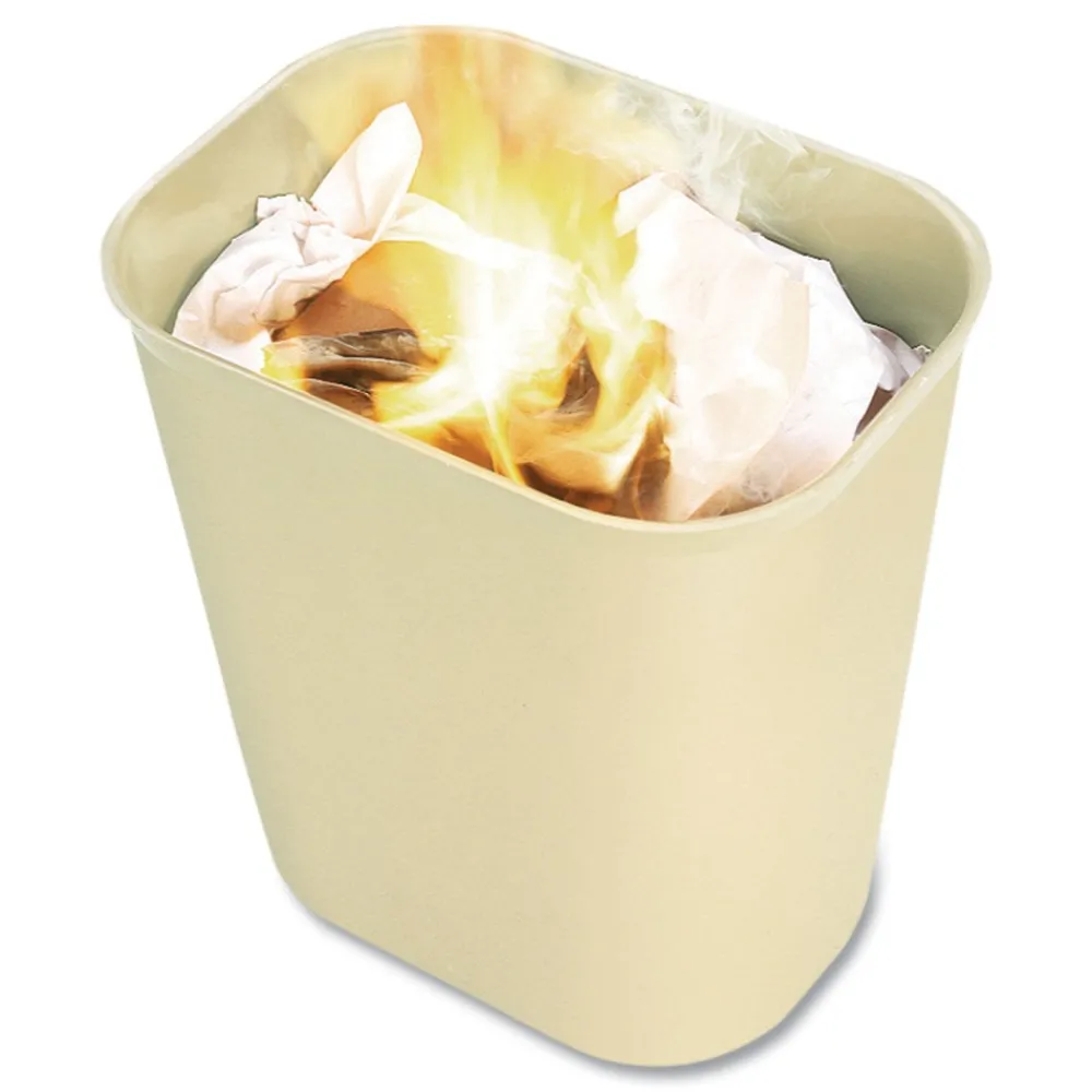 Rubbermaid Commercial Fire-Resistant Trash Cans feature a contemporary shape with a UL rating. This rectangular, liquid-injected, thermoset polyester garbage can has a textured finish and smooth corners and contours for cleaning. Thermoset polyester is resistant to heat and impact. The trash can’s textured finish helps hide surface scratches.