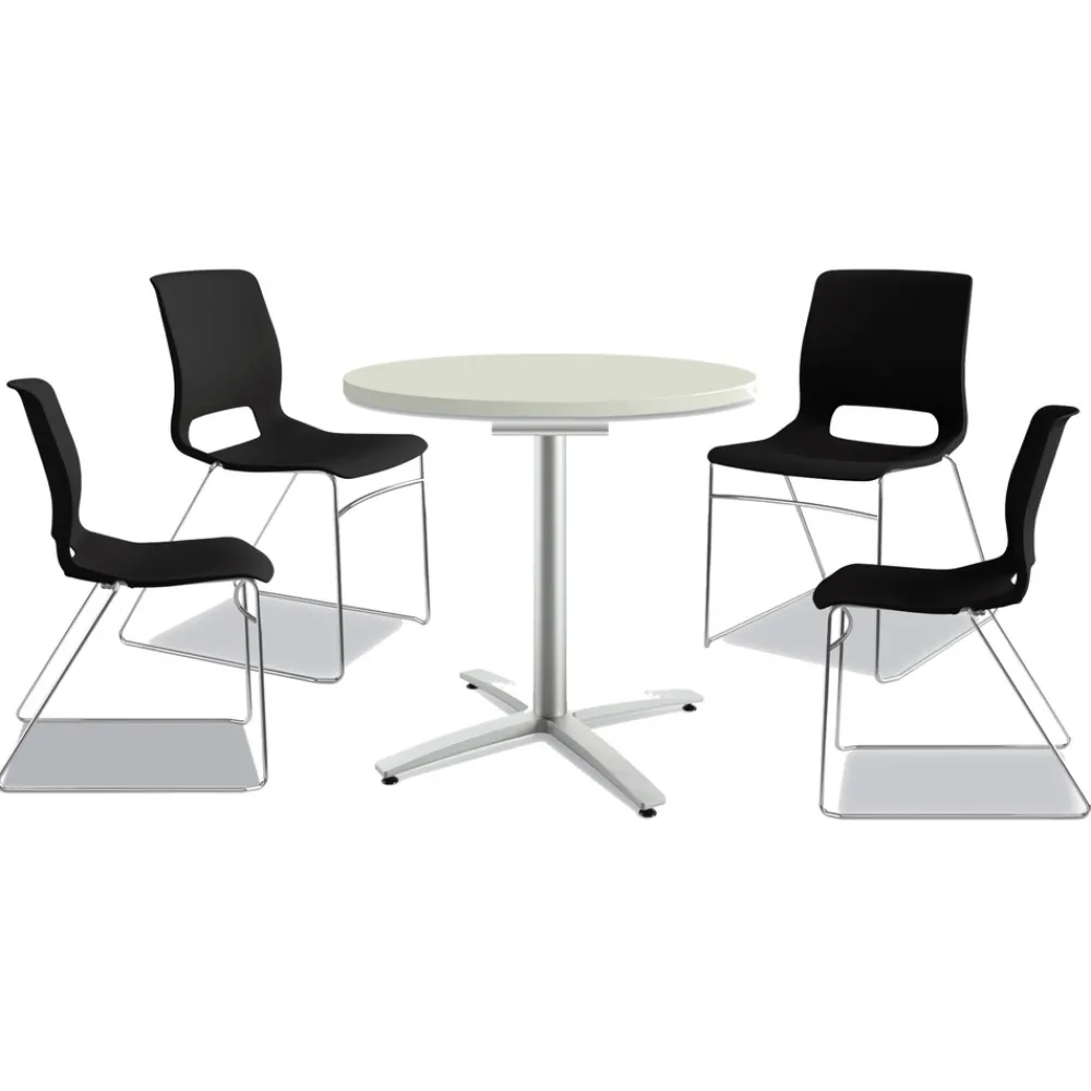 HON HMS1.N.ON.Y Between Seated-Height X-Base with 30 in. Diameter Between Round Table Top and Motivate High-Density Stacking Chair Bundle (4 Chairs/Carton)