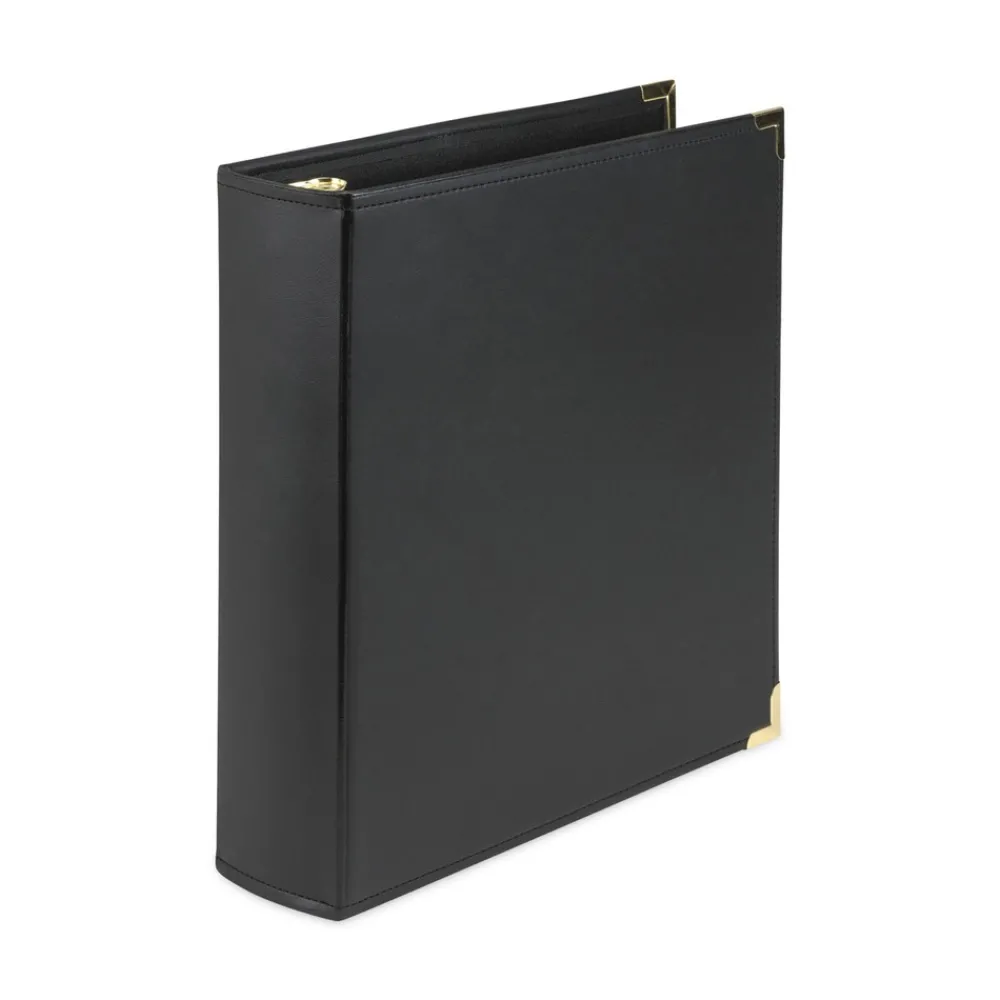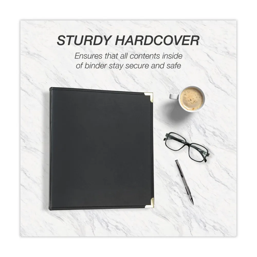 Rigid, leather-like cover with hand-stitched edges and brass-plated metal rings and corners give a clean, professional, upscale appearance.