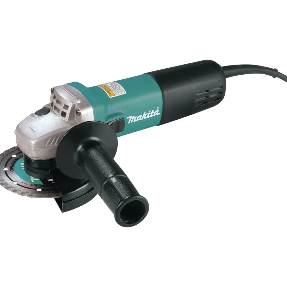 Makita’s 4-1/2 in. AC/DC Angle Grinder has an exclusive labyrinth construction that seals the motor and bearing from contamination. Featuring a AC / DC switch that is conveniently located on the top of the motor housing; a small circumfrence barrel grip for easy handling, a high power-to-weight ratior and a double insulated motor. A spindle lock makes wheel changes easy and the side handle can be installed on either side of the tool.