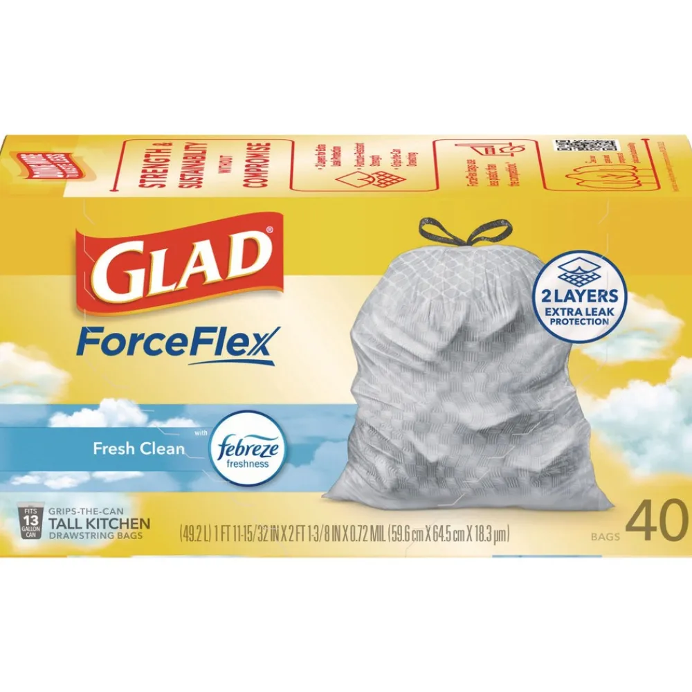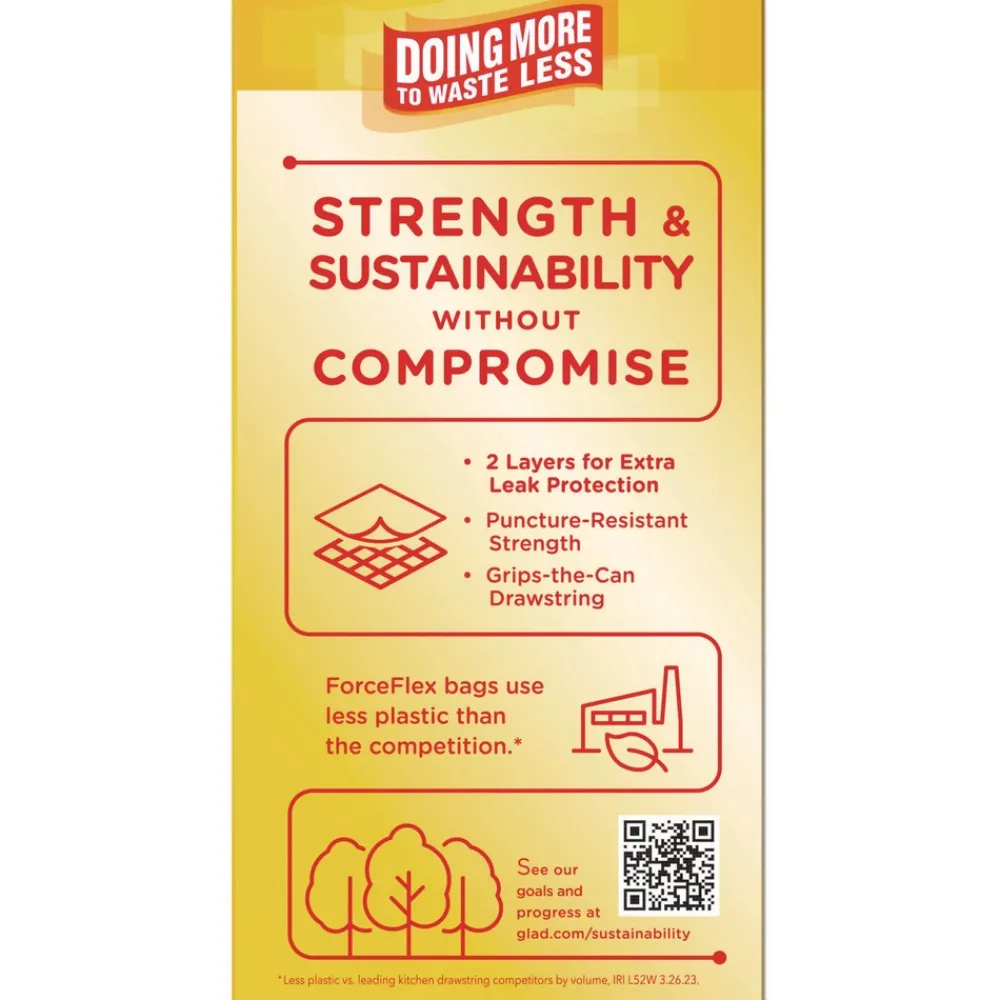 Fight nasty kitchen odors with Glad trash bags. Glad Kitchen Drawstring Trash Bags are designed with ForceFlex technology to give extra flex as it expands around sharp edges and heavy loads, so you can pack it in while resisting tears, rips and punctures. Keeps your kitchen smelling pleasantly fresh with long lasting odor control. Let the stretchable strength of Glad handle all the messes our busy daily life can throw at it and then some. With double-sided seals and a reinforced bottom, these bags are designed with RipGuard and LeakGuard technology to prevent seepage of liquids and keep trash contained. The durable Grips-The-Can Drawstring ensures a tight grip on the trash can to keep it in place. Take the trash to the curb with no fear of leaks and tears, and no frustration. Keep your kitchen smelling clean with the stretchable strength of Glad. Ideal for use in offices, schools, daycare centers, restaurants, hotels and other commercial facilities.