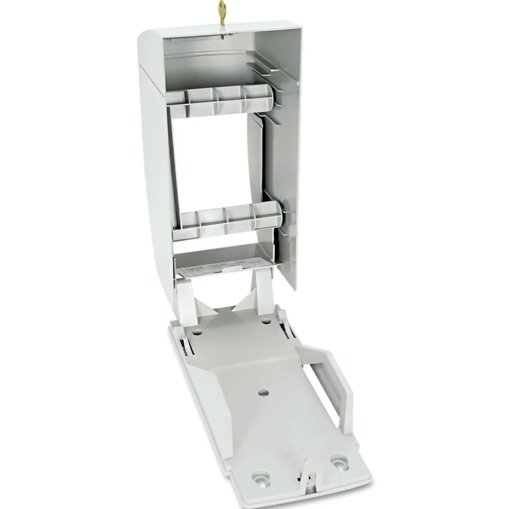 Holds two standard rolls up to 5 3/4″. Extra roll easily shifts into place when bottom roll is depleted, saves time on maintenance. Made of durable impact-resistant ABS plastic. Corrosion and chip resistant. Includes concealed locking device.