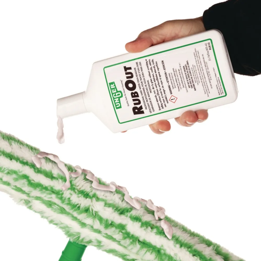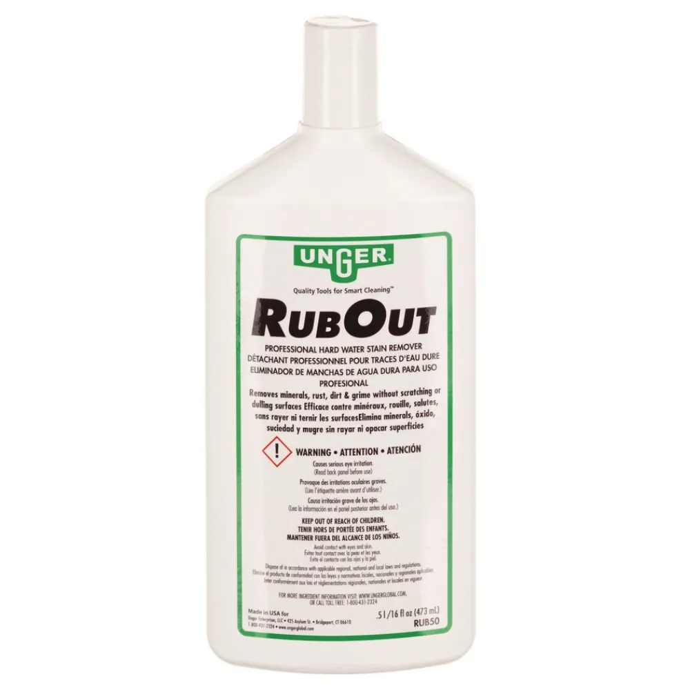 Keep your glass surfaces sparkling clean with the Unger RubOut Glass Cleaner. This heavy-duty glass cleaner removes hard water stains, rust, mineral deposits, lime scale, and soap scum with ease so you can maintain healthy and attractive glass at all times. Handy 16 oz bottle will fit perfectly in your janitorial bucket or cart. It’s perfect for restroom mirrors, windows, or any glass surface that needs some attention. This gentle formula will make surfaces look like new and keep your establishment looking its best!