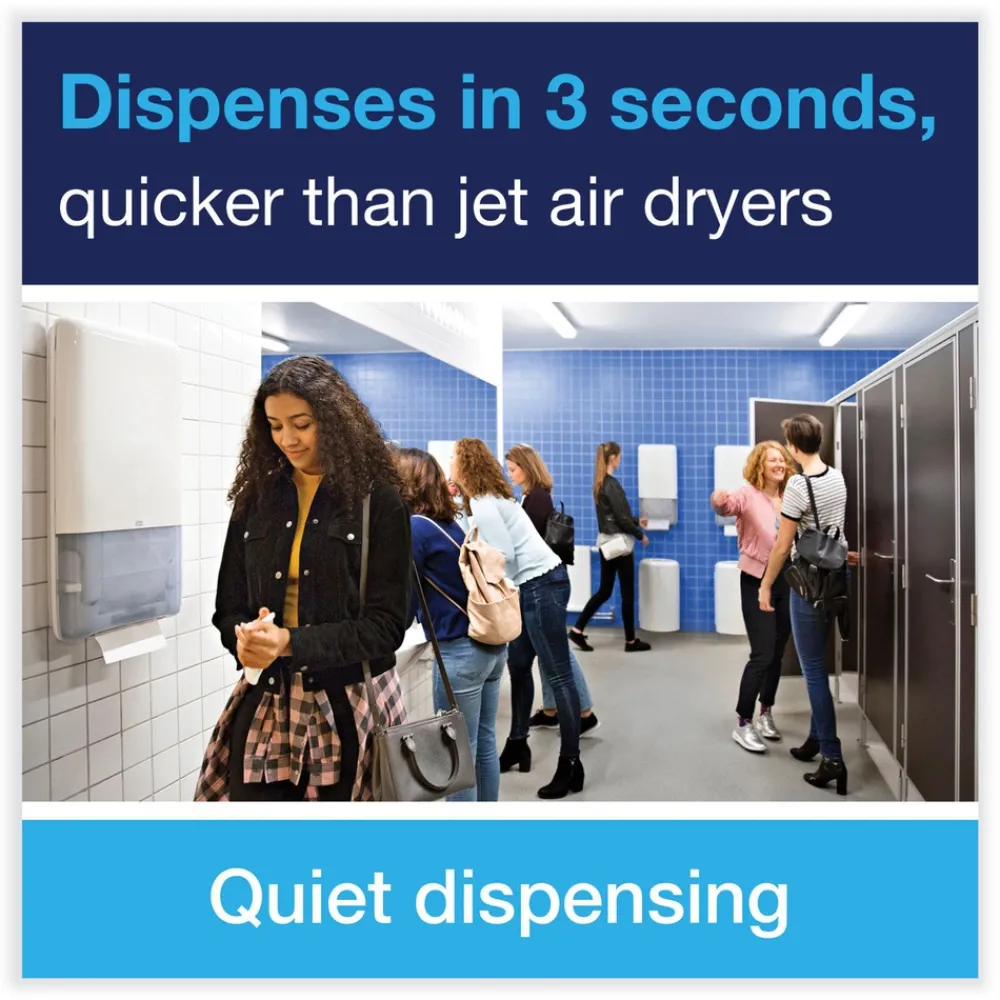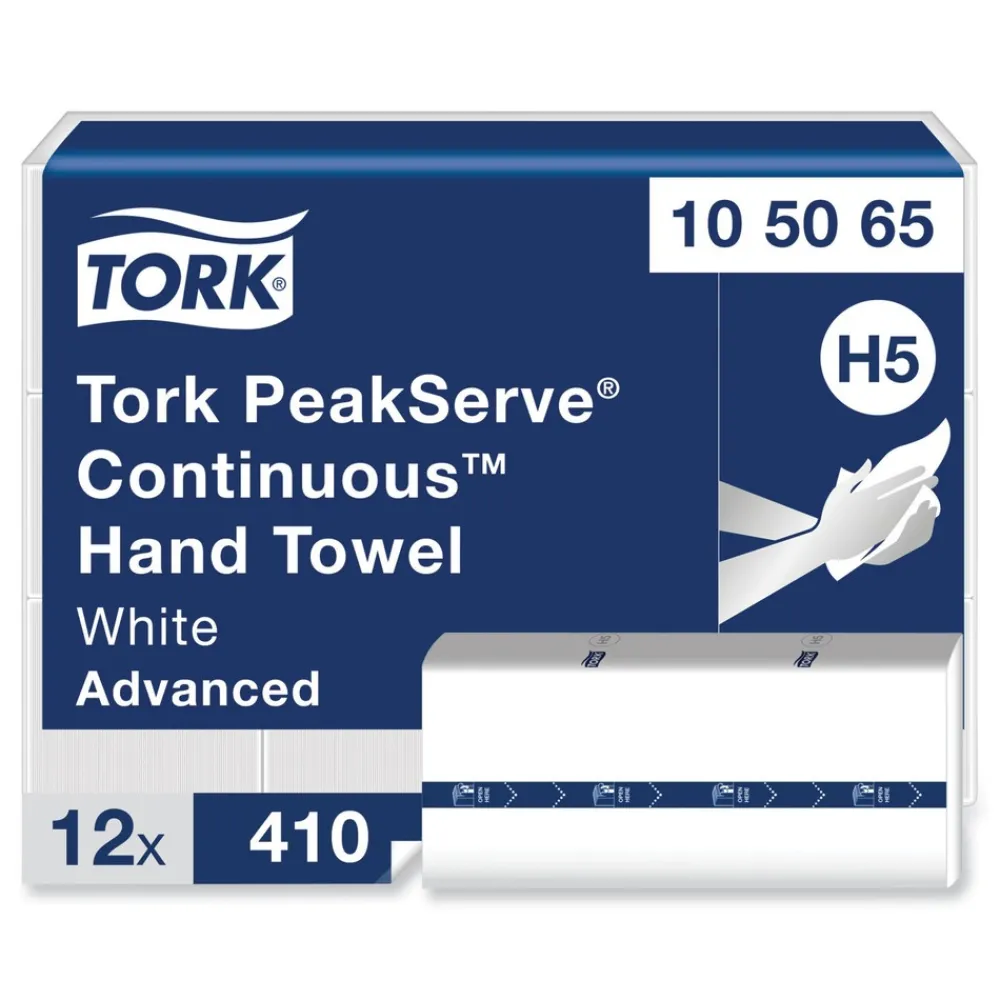 Tork® PeakServe® Continuousâ„¢ Hand Towels means fewer washroom delays—gets guests in and out faster. Avoid run outs with 250% more hand towels and lower consumption thanks to one-at-a-time dispensing. Faster dispensing serves guests in three seconds—quicker than jet air drying time. Taking a towel is always smooth and easy with our patented continuous towel system. More flexibility means more time to clean. Top it up when it suits you with up to 600 more guests served between refills. Double the towels you carry as they’re compressed by 50%. Cut refill time in half with over 2,000 towels per dispenser. Poly bag wrapped.