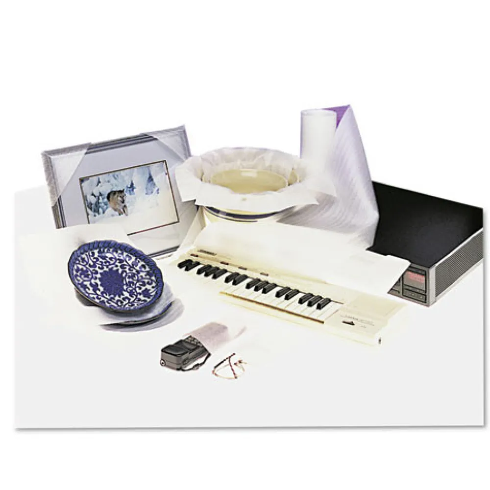 Nonabrasive, lightweight, moisture-resistant packaging material made of low-density foam for many packing and protective uses. Due to its high-cling capability, it holds protected objects snugly, but it leaves behind no sticky residue after contents are unpacked. Contains material that is recyclable, so waste issues are less problematic for shippers and recipients concerned about the environment. Dispenser box keeps content neat and organized until it is cut for use.