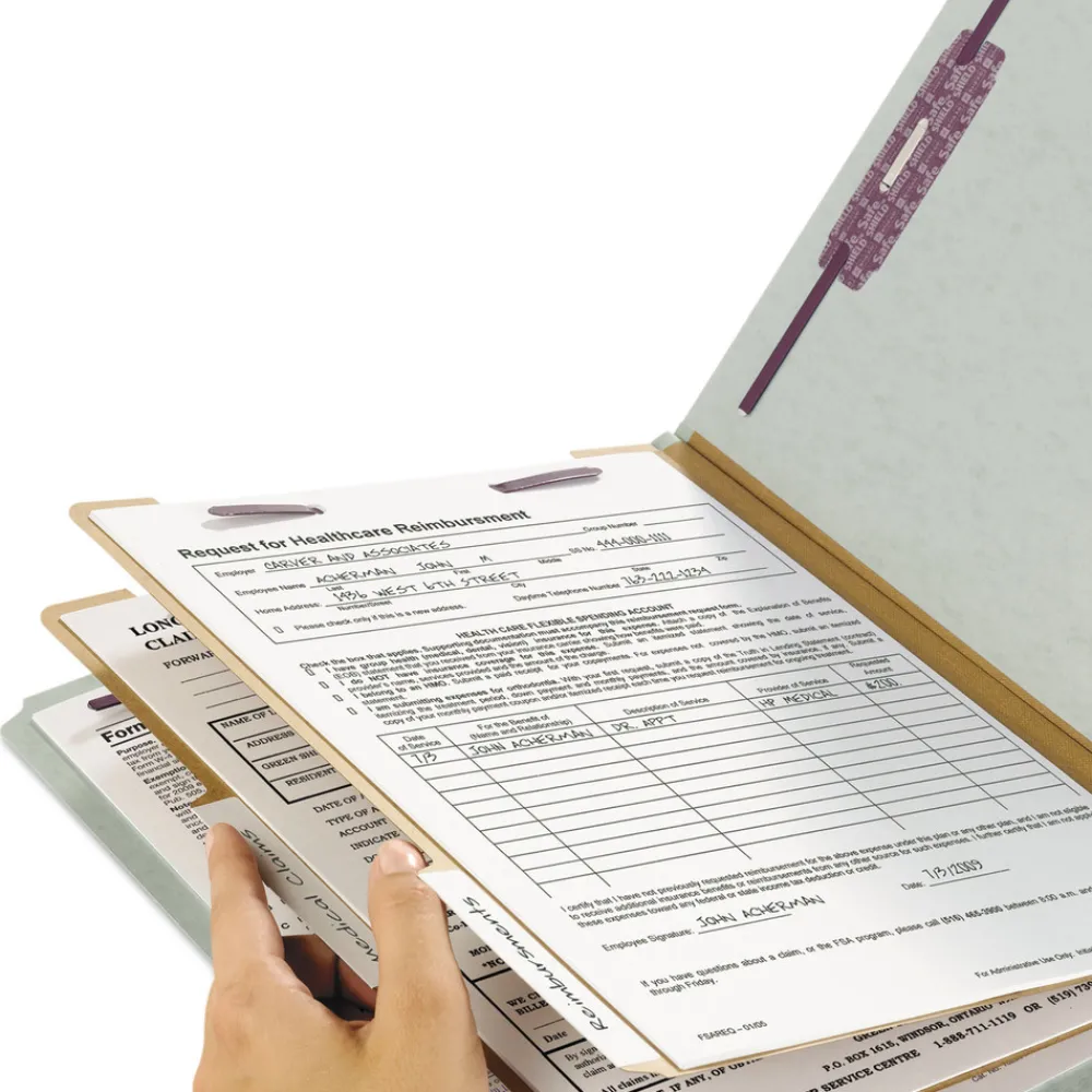 The ultimate classification folder when safety and security are most important. SafeSHIELD bonded fasteners add protection for papers and fingers, while also reducing fastener crinkling. Dividers with tabs and fasteners on both sides let you store information under several subdivisions, and fasteners on the front and back panels add two more filing surfaces. Made of heavyweight pressboard material for extra durability. Use different colors for different types of projects. Labels sold separately.