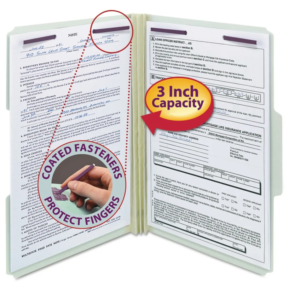 Protect your documents and fingers with Smead patented SafeSHIELD Coated Fastener Technology; the ultimate solution to fastener issues, including paper tears, finger cuts and excessive fastener crinkling. Made for large, bulky files that get plenty of use. Excellent for project files, loans, legal files or anytime you need to keep large amounts of paperwork in sequential order for frequent reference.